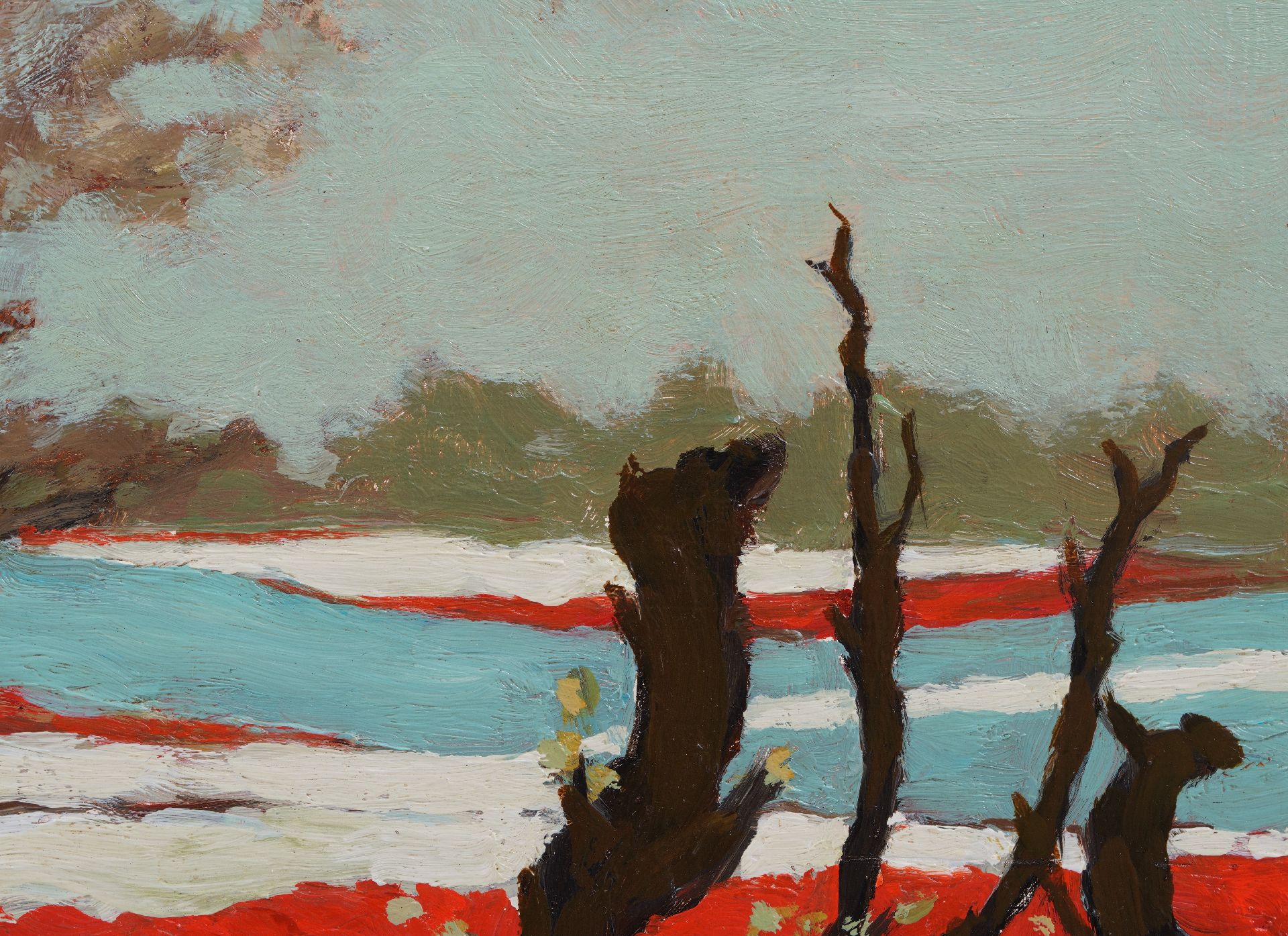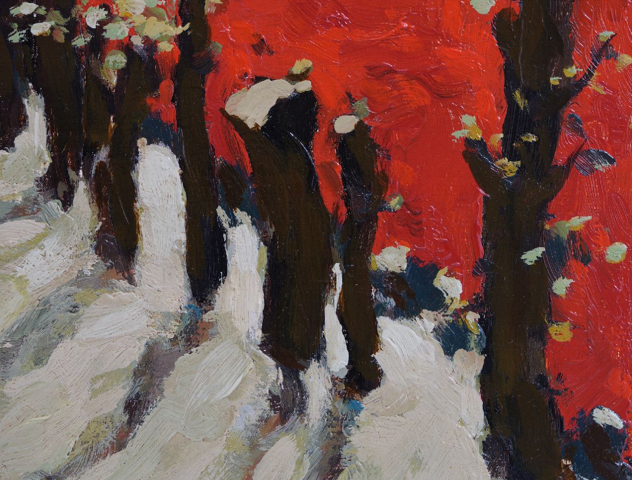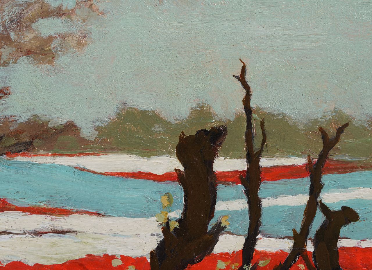 Dit werk doet Japans aan door het kleurgebruik en het zilverachtige wit van de bladeren. De singels van elzen dienden als windschermen en voorkwamen zo de verspreiding van bollenziekten.