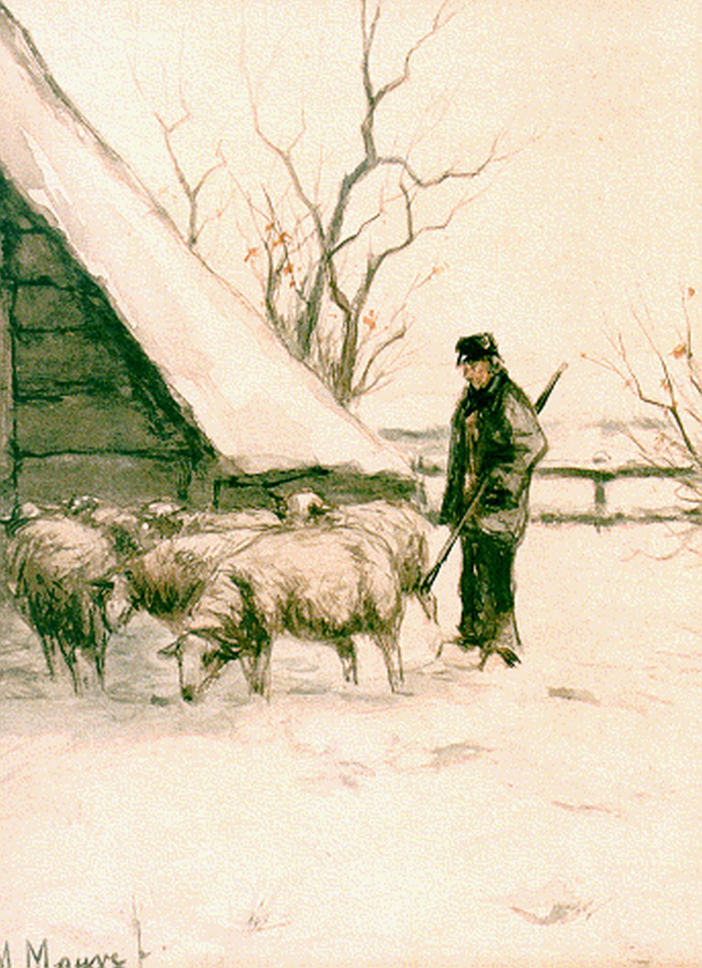 Anton Mauve kunstwerk • aquarel • tekening • voorheen te koop Herder bij een schaapskooi