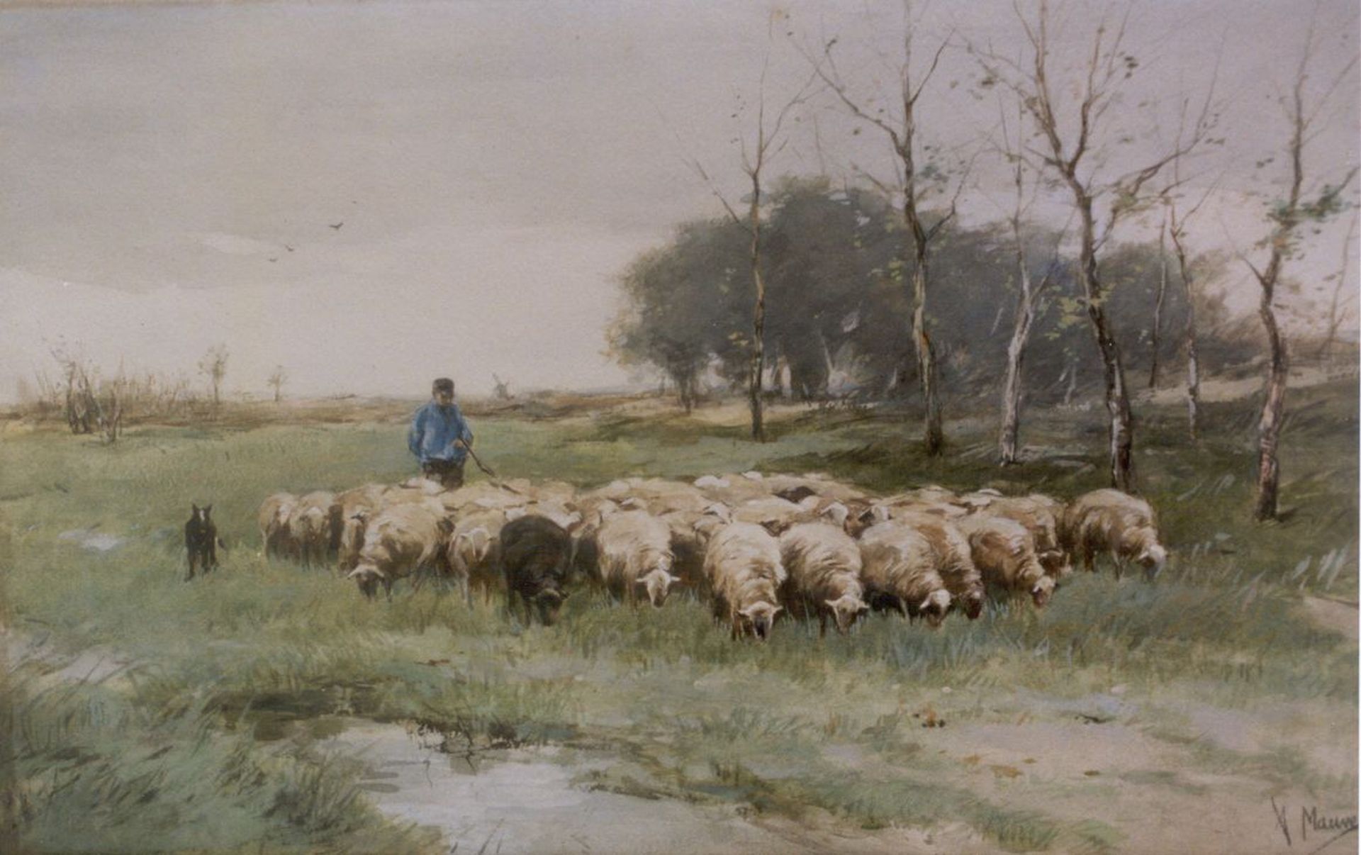 Anton Mauve kunstwerk • aquarel • tekening • voorheen te koop Herder met zijn kudde schapen (toe)