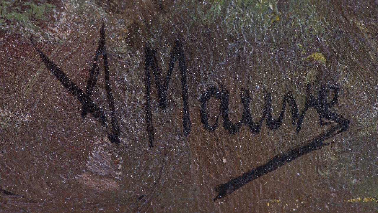 Anton Mauve is een van de bekendste schilders van de Haagse School. Zijn opleiding kreeg hij bij de dierenschilders P.F. van Os en Wouterus Verschuur. Ook werkte hij enige tijd in Oosterbeek met P.J.C. Gabriel. Landschap en dieren combineert hij vaak in zijn schilderijen. Na enige omzwervingen vestigde hij zich in 1871 in Den Haag, later in Laren, waar hij vooral de heide schilderde met wollige schaapskuddes vervloeiend in de zilvergrijze tonen van het landschap. Een van zijn meest geliefde plekjes was een even buiten Laren gelegen stuk woeste grond, later Mauvezand genoemd.