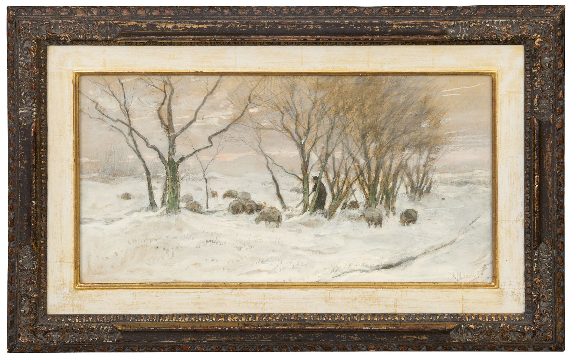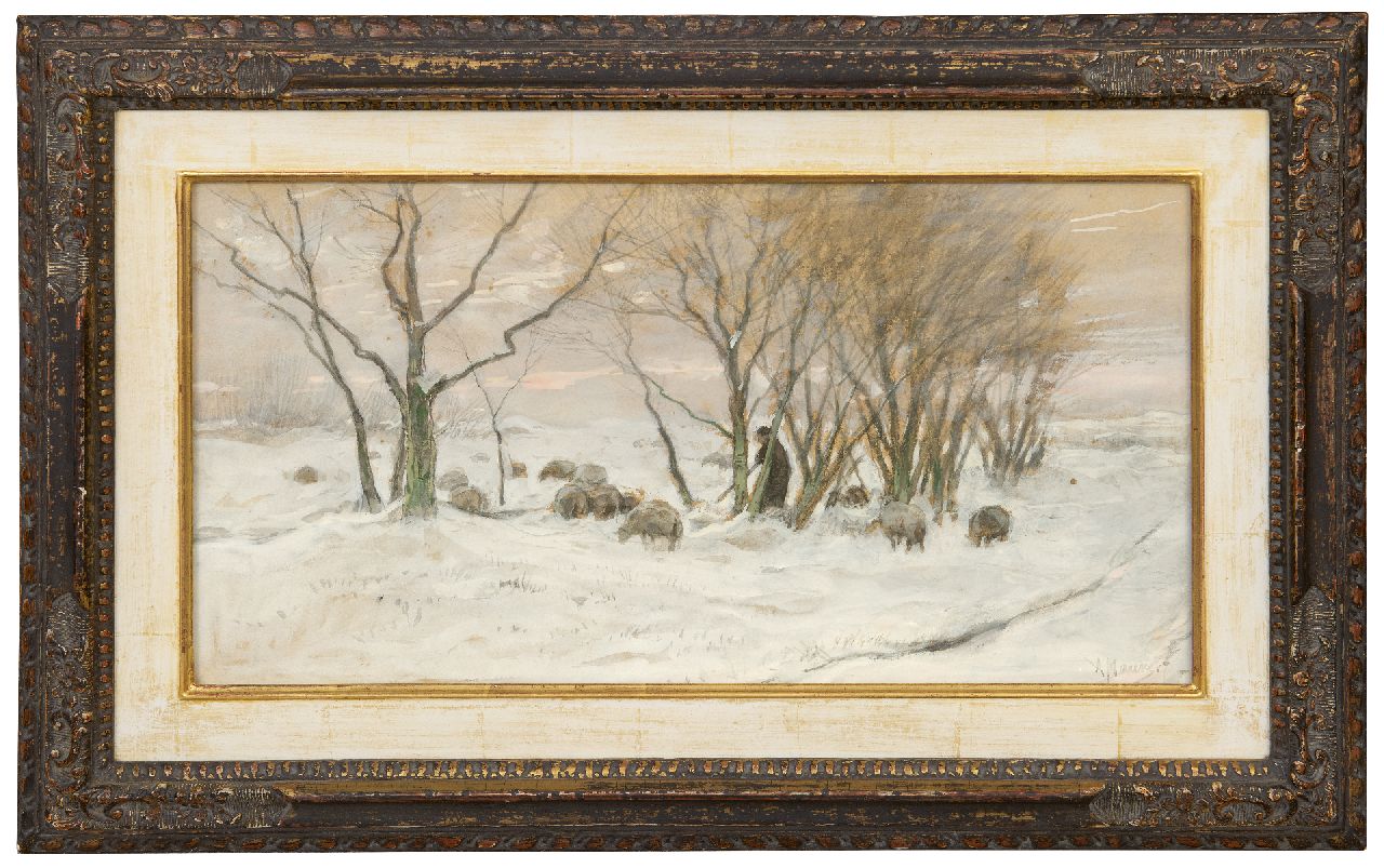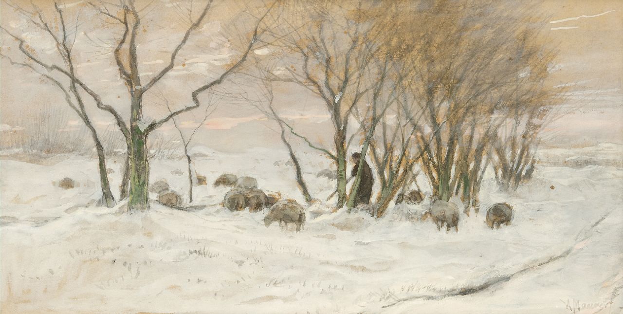 Anton Mauve kunstwerk • aquarel • tekening • te koop Herder en schapen in de sneeuw