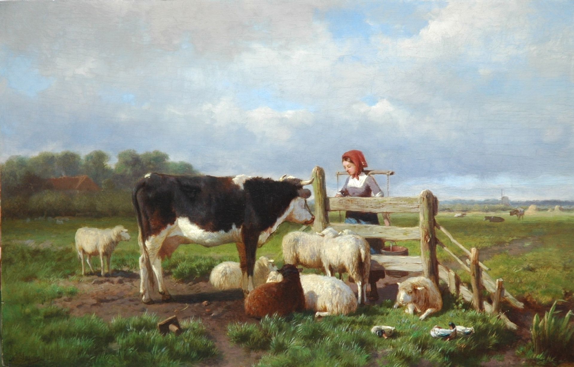 Melkmeisje en vee bij een hek