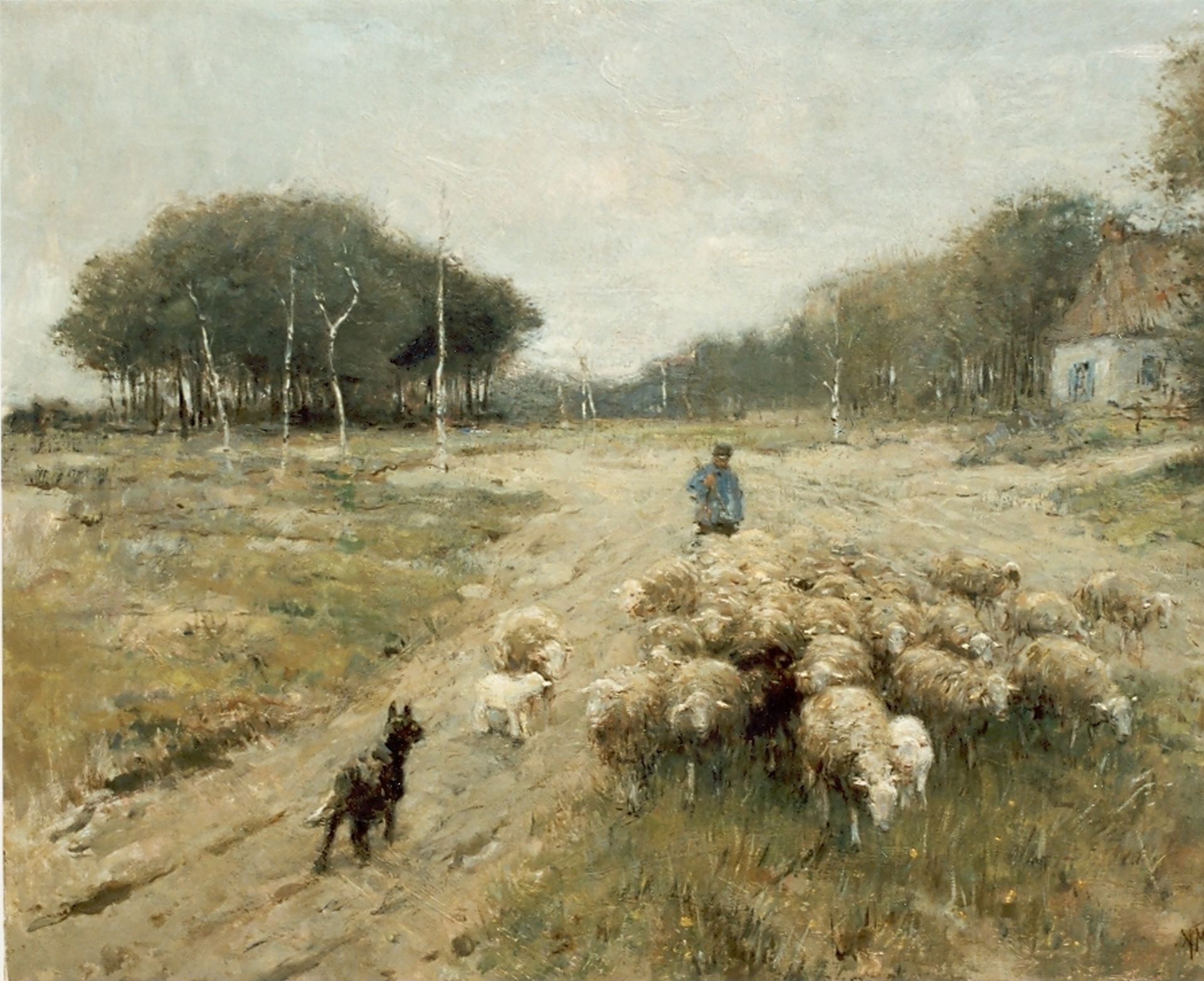 Anton Mauve is een van de bekendste schilders van de Haagse School. Zijn opleiding kreeg hij bij de dierenschilders P.F. van Os en Wouterus Verschuur. Ook werkte hij enige tijd in Oosterbeek met P.J.C. Gabriel. Landschap en dieren combineert hij vaak in zijn schilderijen. Na enige omzwervingen vestigde hij zich in 1871 in Den Haag, later in Laren, waar hij vooral de heide schilderde met wollige schaapskuddes vervloeiend in de zilvergrijze tonen van het landschap. Een van zijn meest geliefde plekjes was een even buiten Laren gelegen stuk woeste grond, later Mauvezand genoemd.