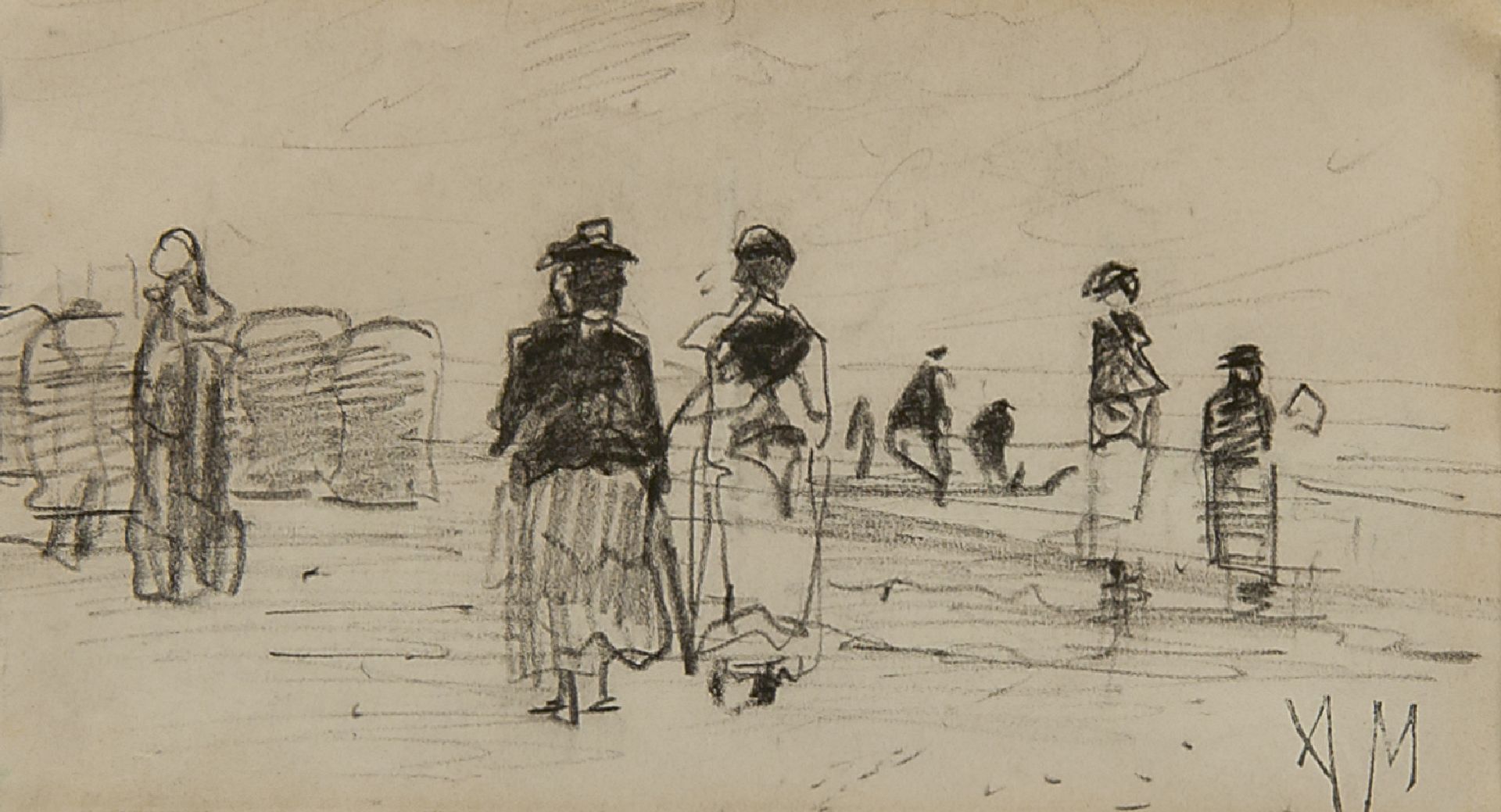 Anton Mauve kunstwerk • aquarel • tekening • voorheen te koop Wandelaars op het strand; verso: Landschap