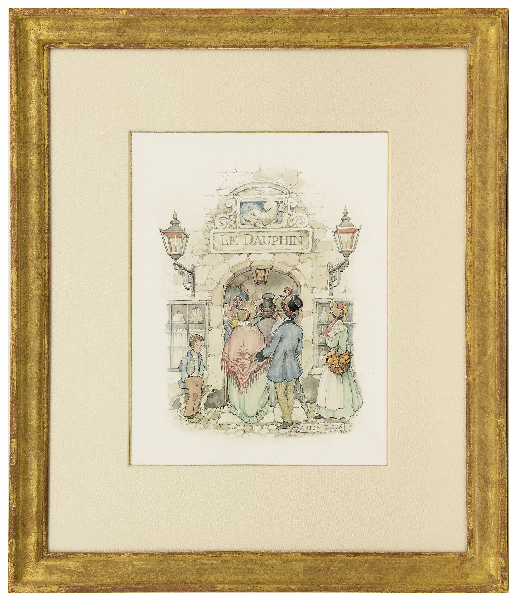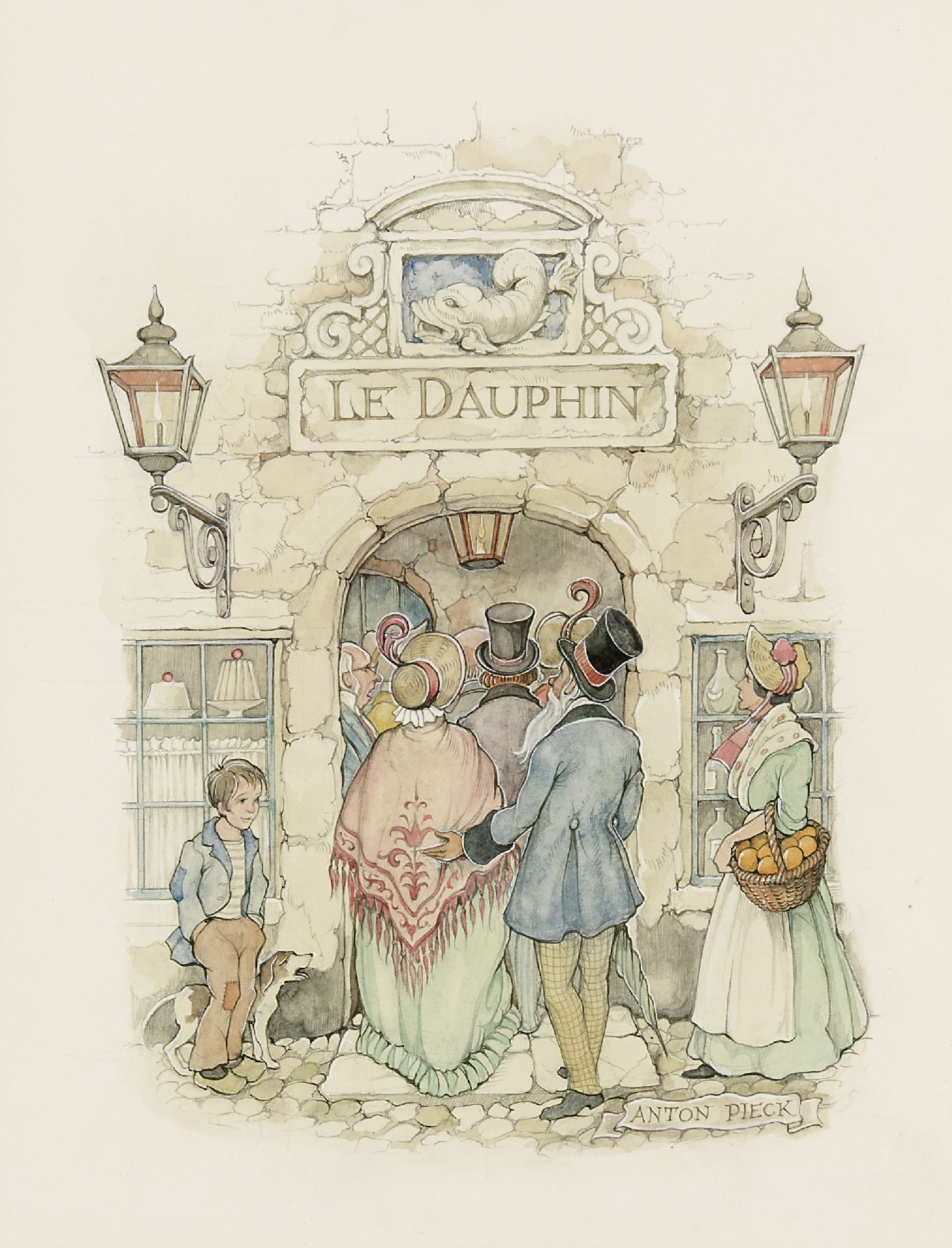 Anton Pieck kunstwerk • aquarel • tekening • voorheen te koop Deftig gezelschap bij het betreden van 'Le Dauphin'