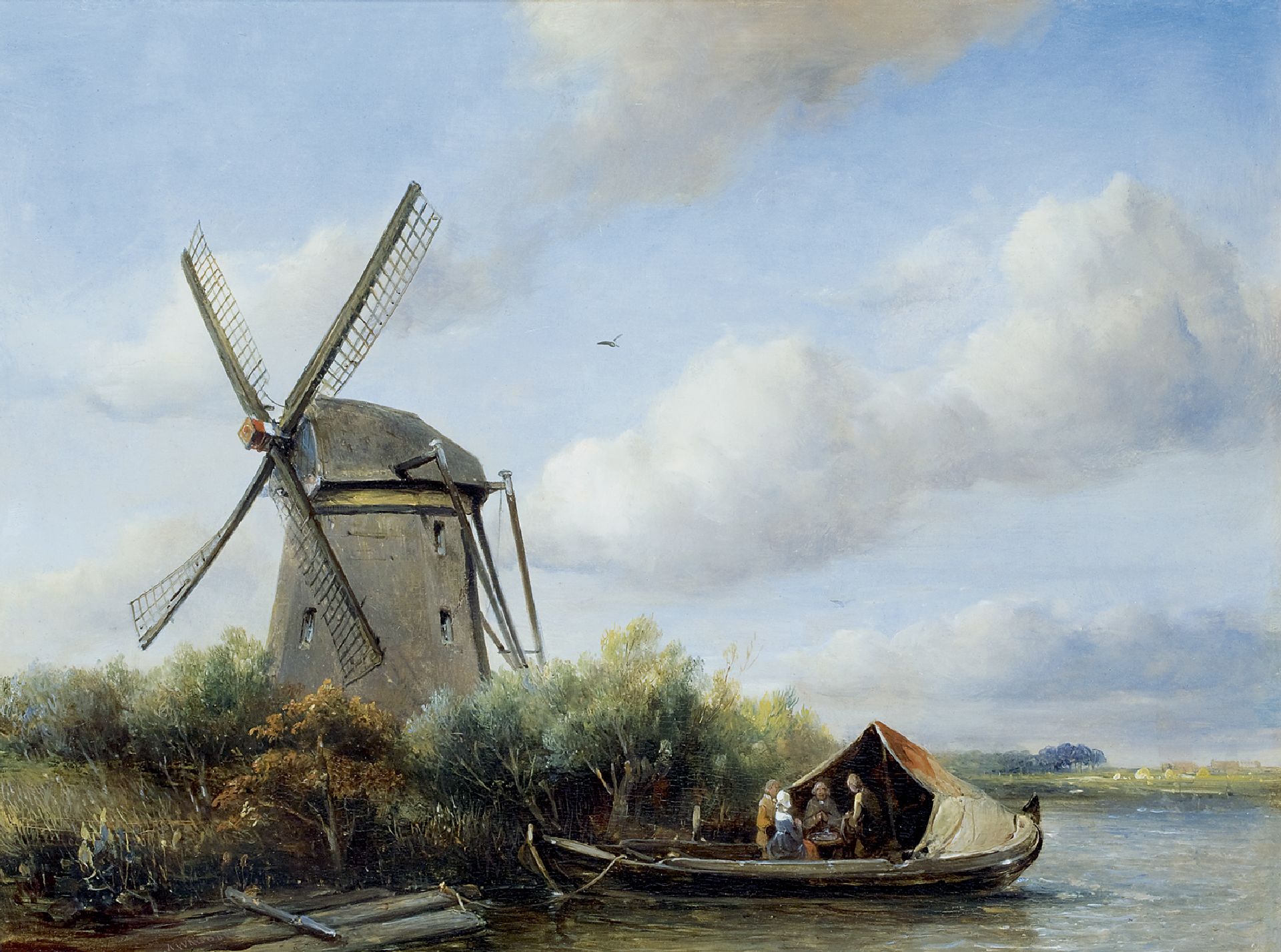 Antonie Waldorp kunstwerk • schilderij • voorheen te koop Figuren in een boot bij een poldermolen
