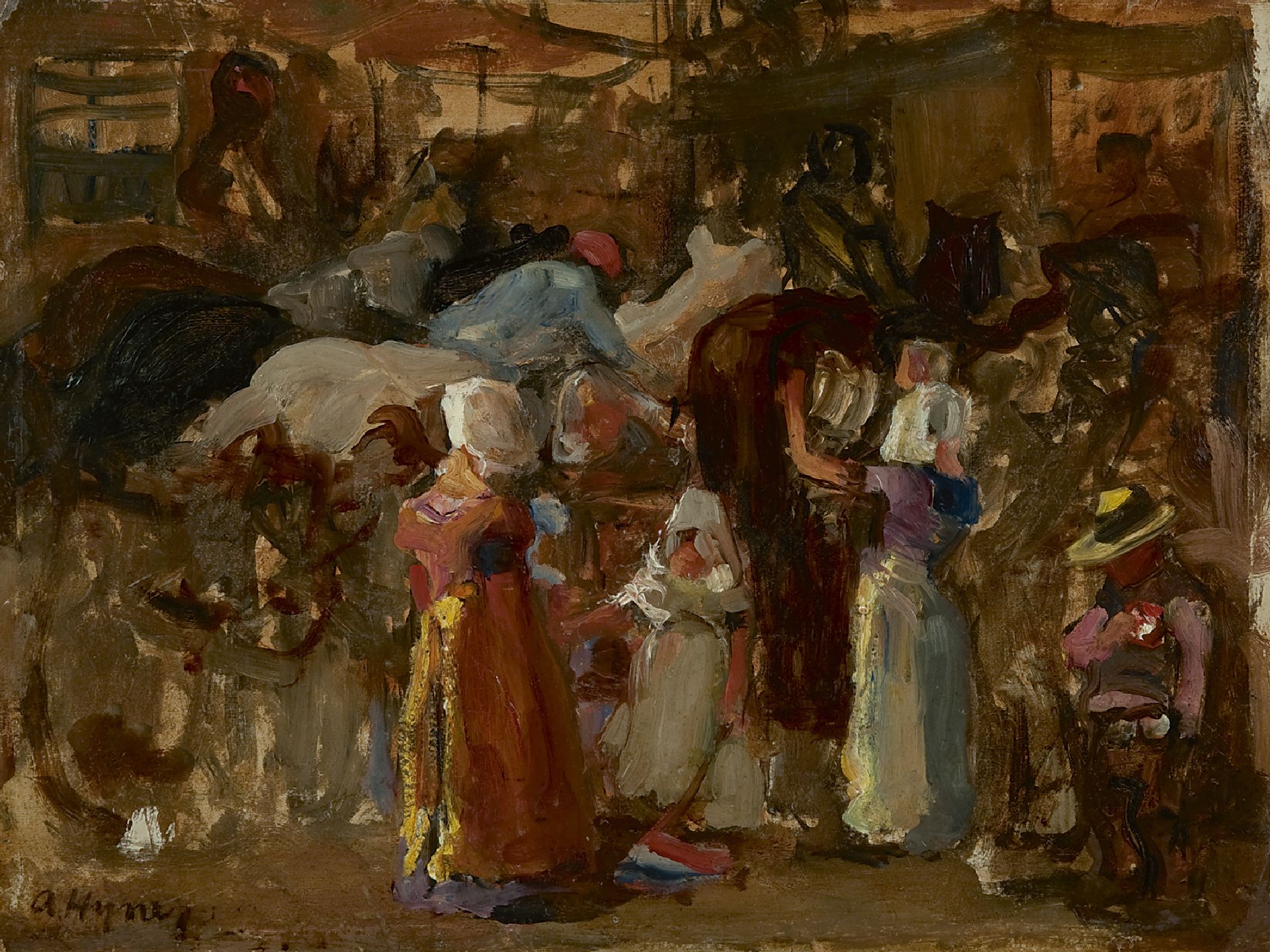 Arend Hijner maakte naam met interieurs en genretaferelen en werkte o.a. in Hilversum, Deventer en Den Haag. Het meest bekend werden zijn voorstellingen van Zeeuwse boerinnen en volksfeesten, die hij tussen 1895 en 1900 schilderde in Wemeldinge bij Goes waar hij een tweede huis bezat. Deze impressionistische ‘plein air’ schetsen en schilderijen ademen levensvreugde door hun directheid en kleurige palet. Als leerling van de academie van Antwerpen had de kunstenaar al vroeg geleerd om fellere kleuren in zijn werk te brengen dan zijn Hollandse tijdgenoten.