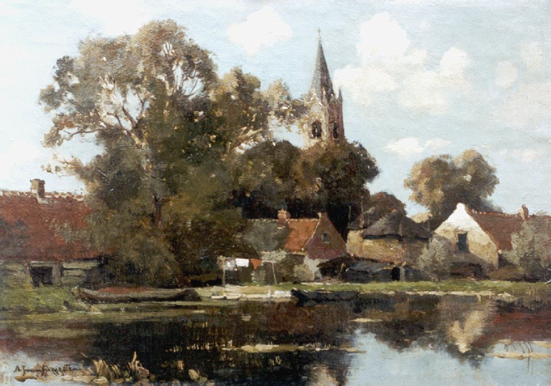 Arend Jan van Driesten kunstwerk • schilderij • voorheen te koop Gezicht op Voorschoten met De Vliet op de voorgrond