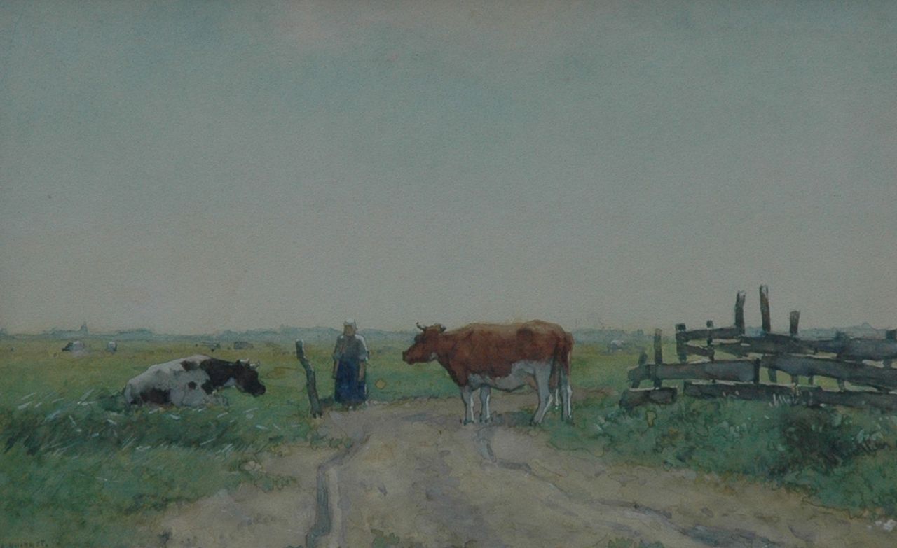 Aris Knikker kunstwerk • aquarel • tekening • voorheen te koop Boerin en koeien in zomers weidelandschap