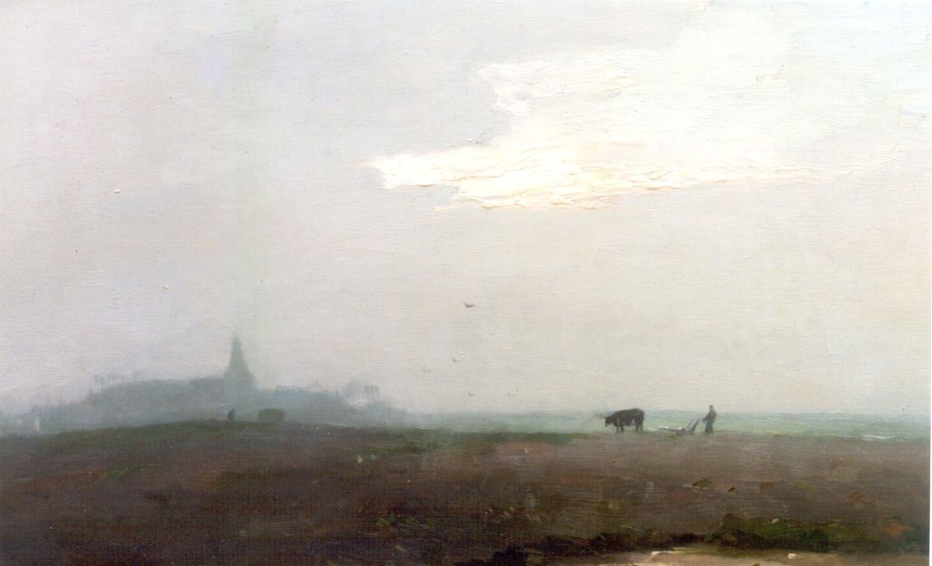 Aris Knikker kunstwerk • schilderij • voorheen te koop Akkerland met ploegende boer