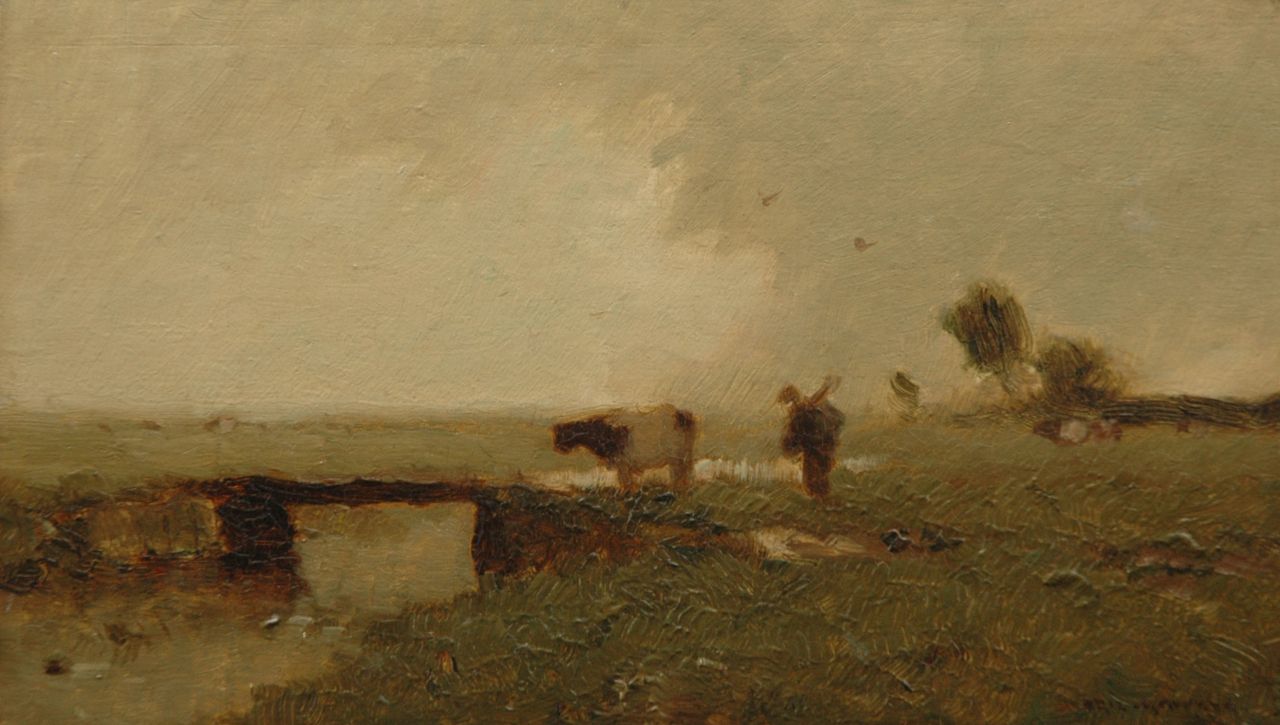 Aris Knikker kunstwerk • schilderij • voorheen te koop Boer met koe bij buiig weer