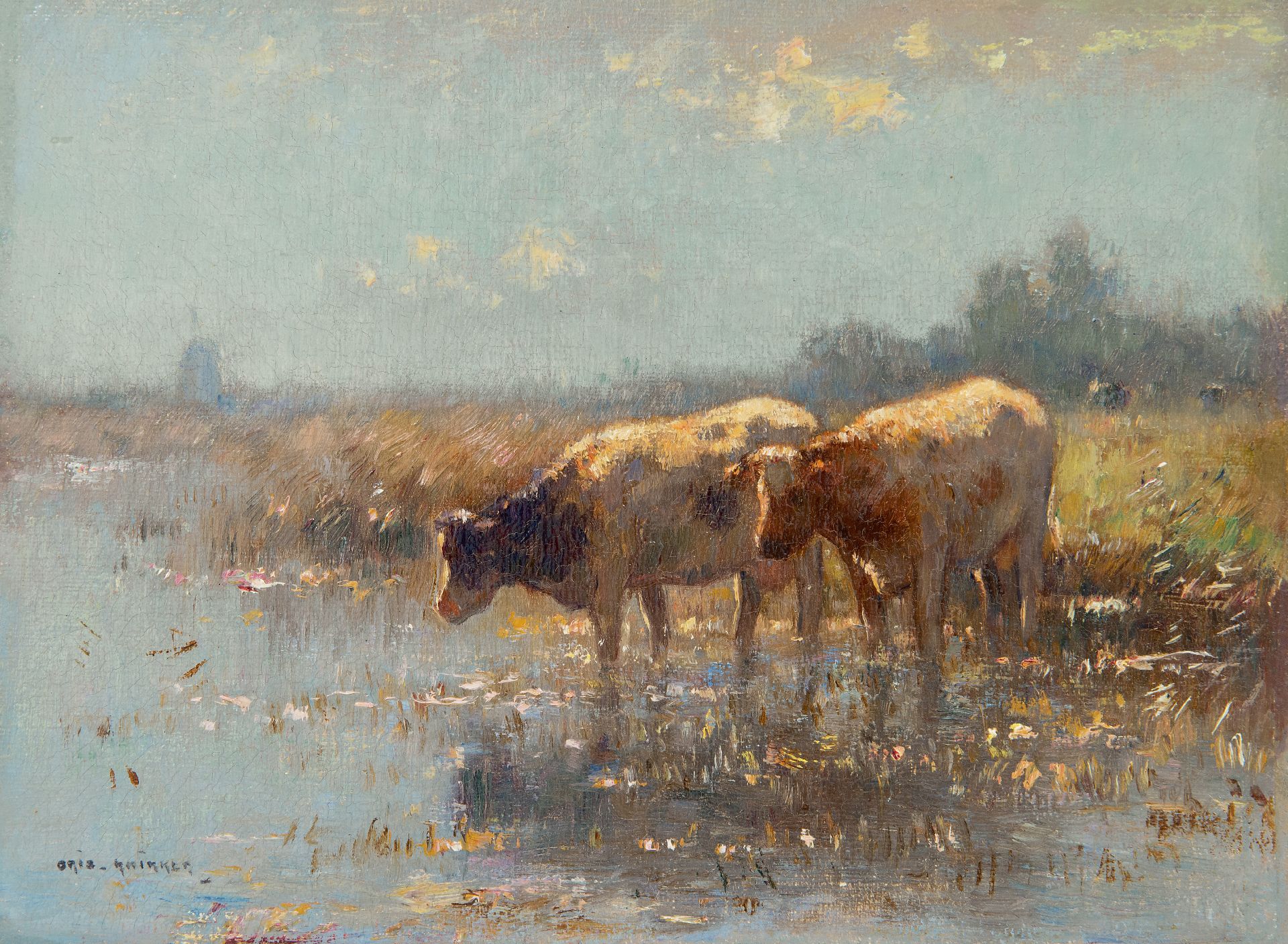 Aris Knikker kunstwerk • schilderij • voorheen te koop Drinkende koeien in weidelandschap