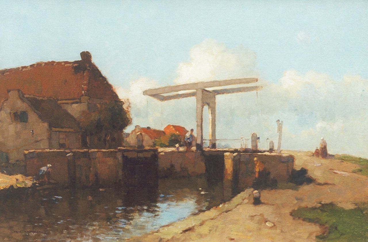Aris Knikker kunstwerk • schilderij • voorheen te koop Gezicht op een sluisje met ophaalbrug