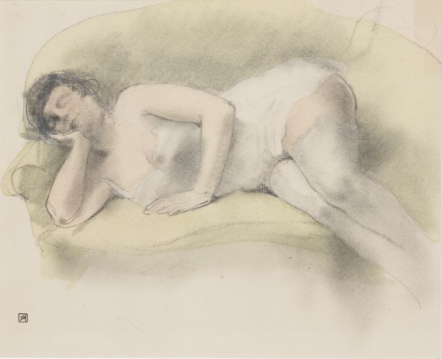 Armand Rassenfosse | Naakt op canapé, krijt en aquarel op papier, 19,0 x 24,0 cm, gesigneerd l.o. met kunstenaarsstempel