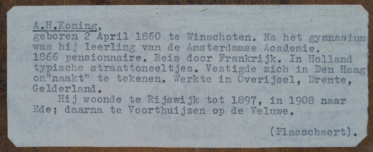 Arnold Koning werd tot kunstschilder opgeleid aan de Rijksakademie in Amsterdam. Hij schilderde, tekende en etste figuren (naakten), landschappen, strandgezichten (strandkoetsjes), maar ook stads- en dorpsgezichten. Regelmatig exposeerde hij zijn werk op de jaarlijkse Tentoonstelling van Levende Meesters, die afwisselend te zien was in onder meer Amsterdam, Groningen, Arnhem en Den Haag. Musea: Kröller-Müller Museum te Otterlo (zeven tekeningen) en het Rijksmuseum Van Bilderbeek Lamaison te Dordrecht.