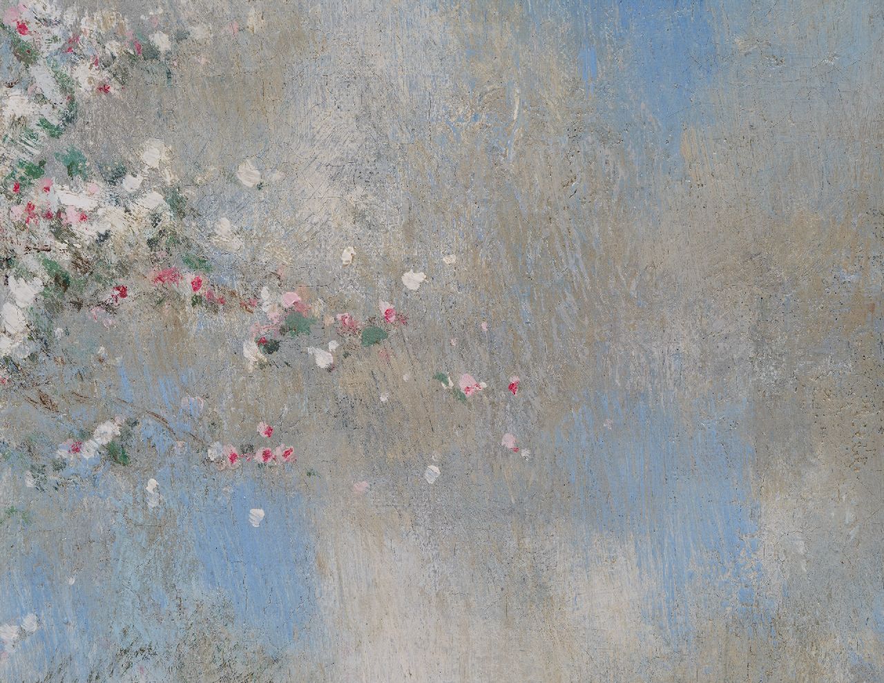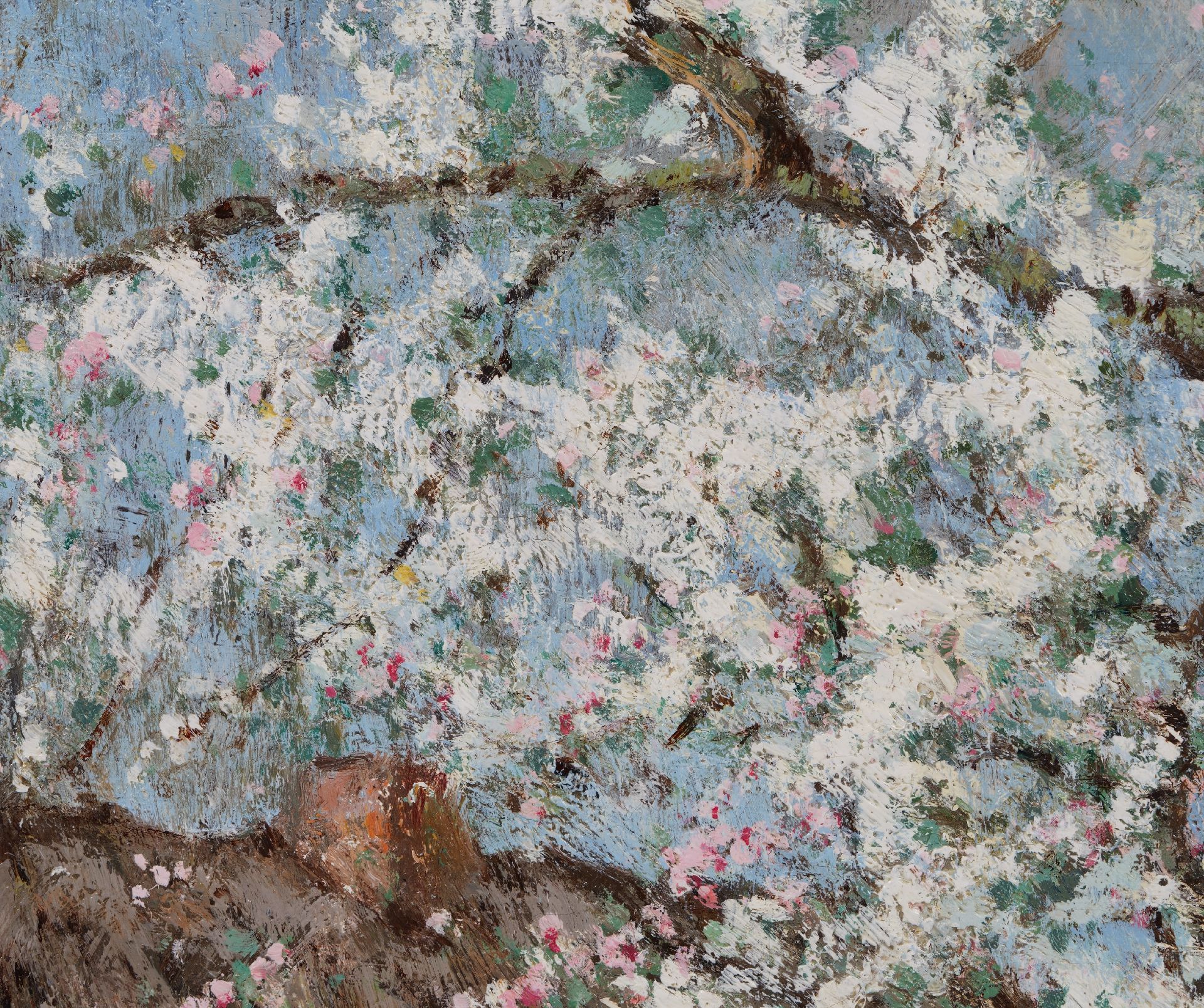 De bloesemboom op de voorgrond vult bijna het hele doek en zorgt voor dieptewerking. Met dit werk schilderde Gorter Twente op zijn mooist in zijn favoriete jaargetijde.