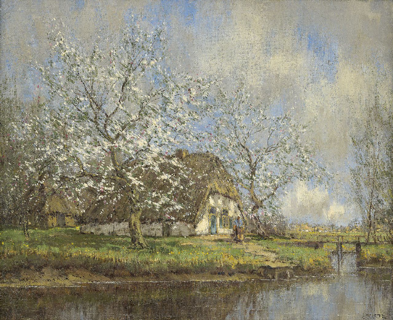 Arnold Marc Gorter kunstwerk • schilderij • voorheen te koop Boerderij met bloeiende bloesembomen