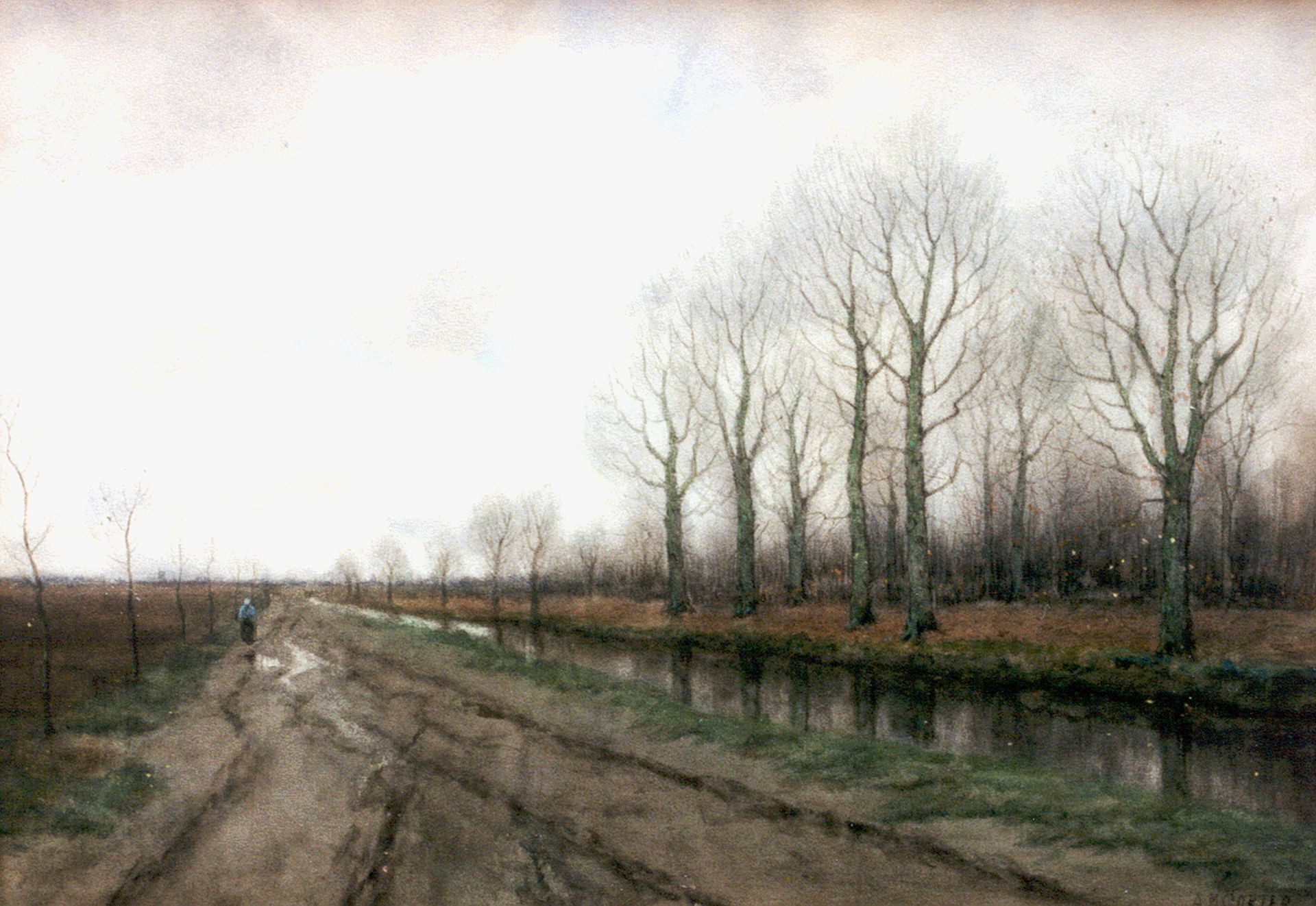 Arnold Marc Gorter kunstwerk • aquarel • tekening • voorheen te koop Winters landschap met boerin langs een vaart