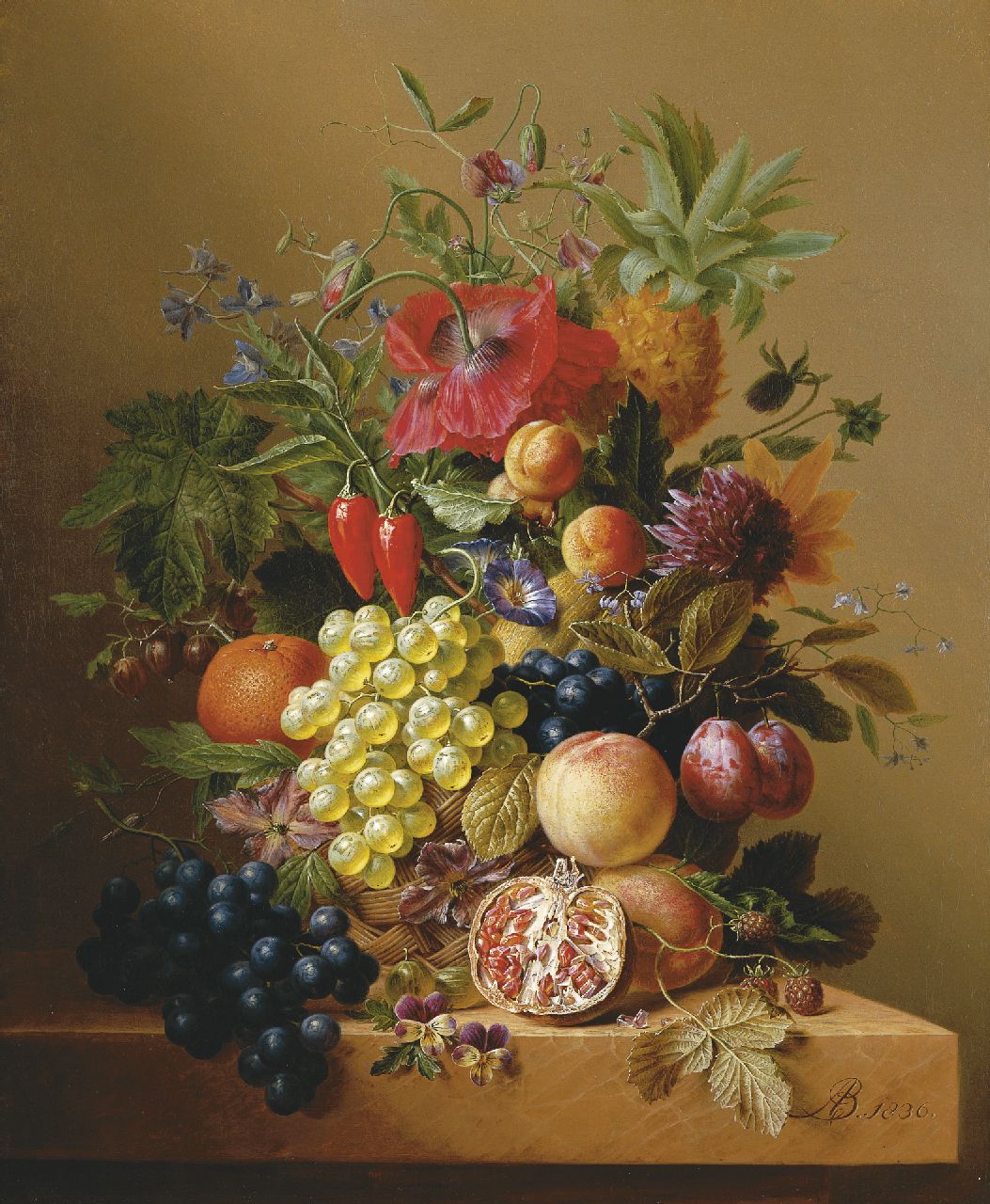 Arnoldus Bloemers kunstwerk • schilderij • voorheen te koop Stilleven met bloemen, fruit en groente