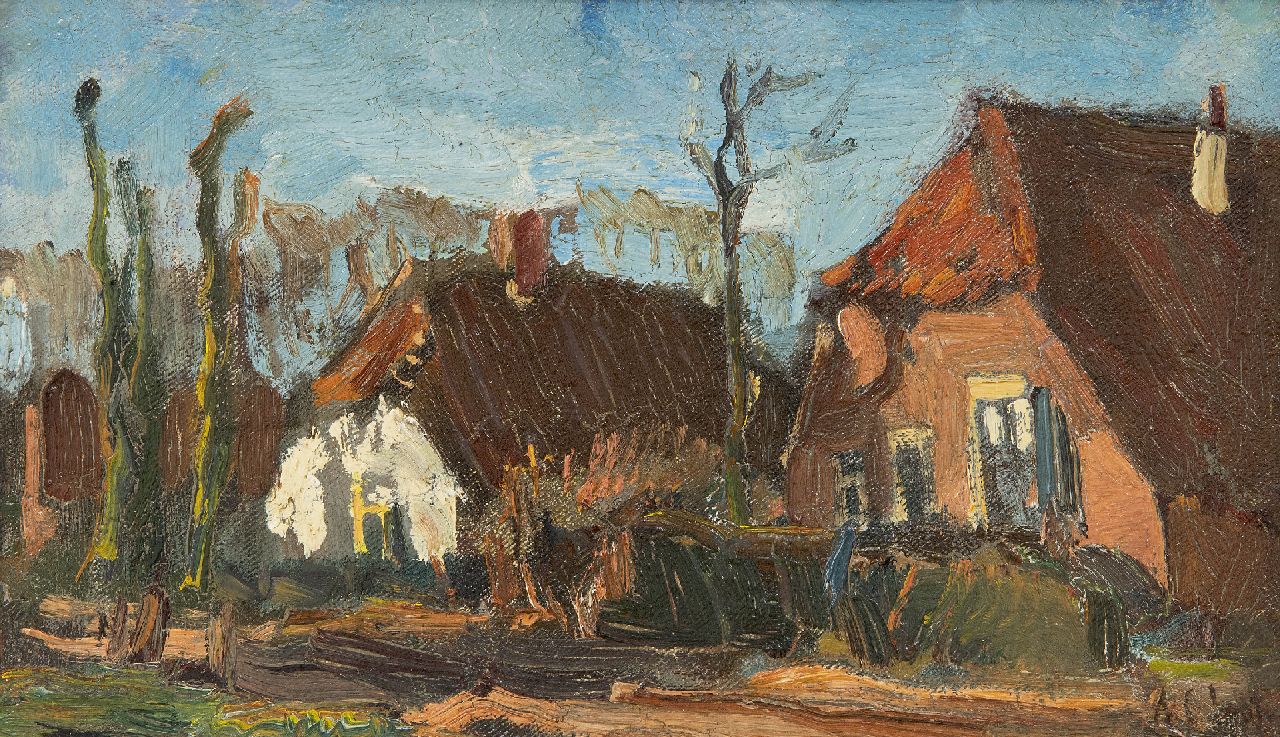 Arnout Colnot | Boerderijen aan een dorpsweg, olieverf op doek op paneel, 14,8 x 24,7 cm, gesigneerd r.o.