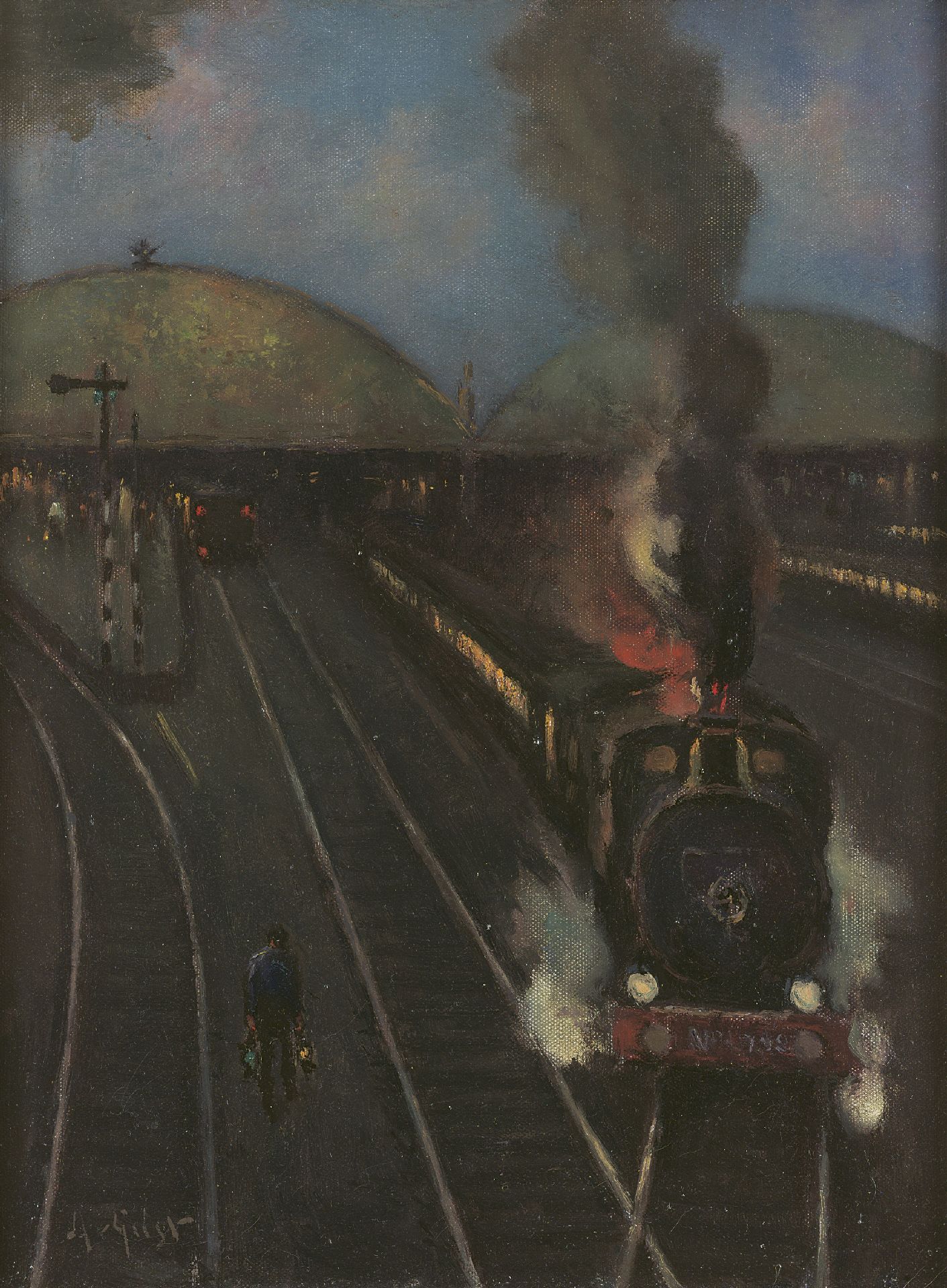 Arnout van Gilst kunstwerk • schilderij • voorheen te koop Stoomtrein bij het station van Amsterdam