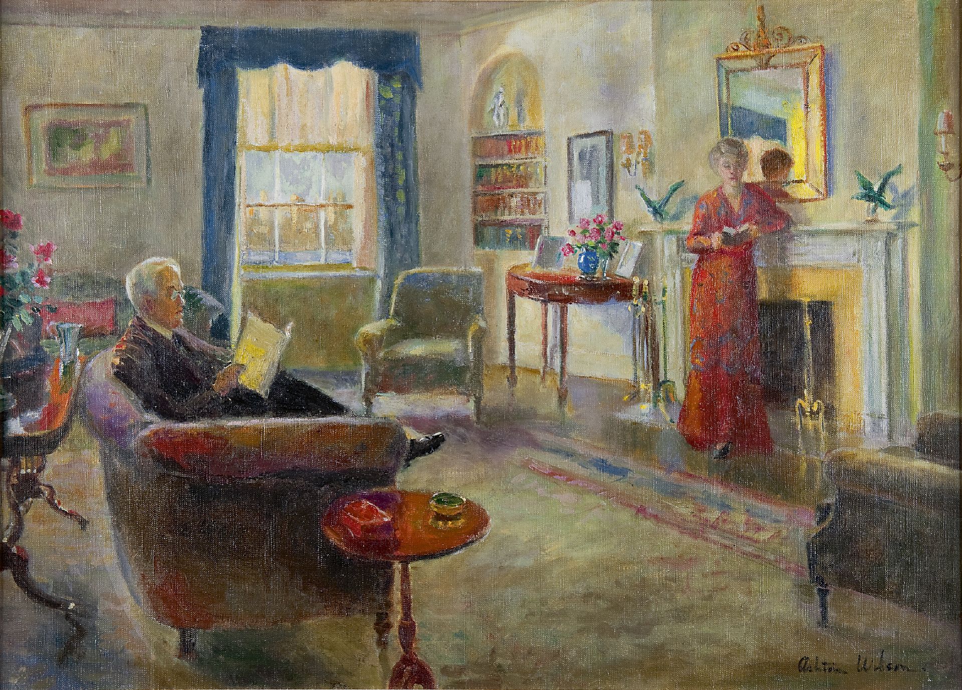 Ashton Wilson kunstwerk • schilderij • voorheen te koop Het leesuurtje; politicus John Davis en zijn vrouw Julia MacDonald.