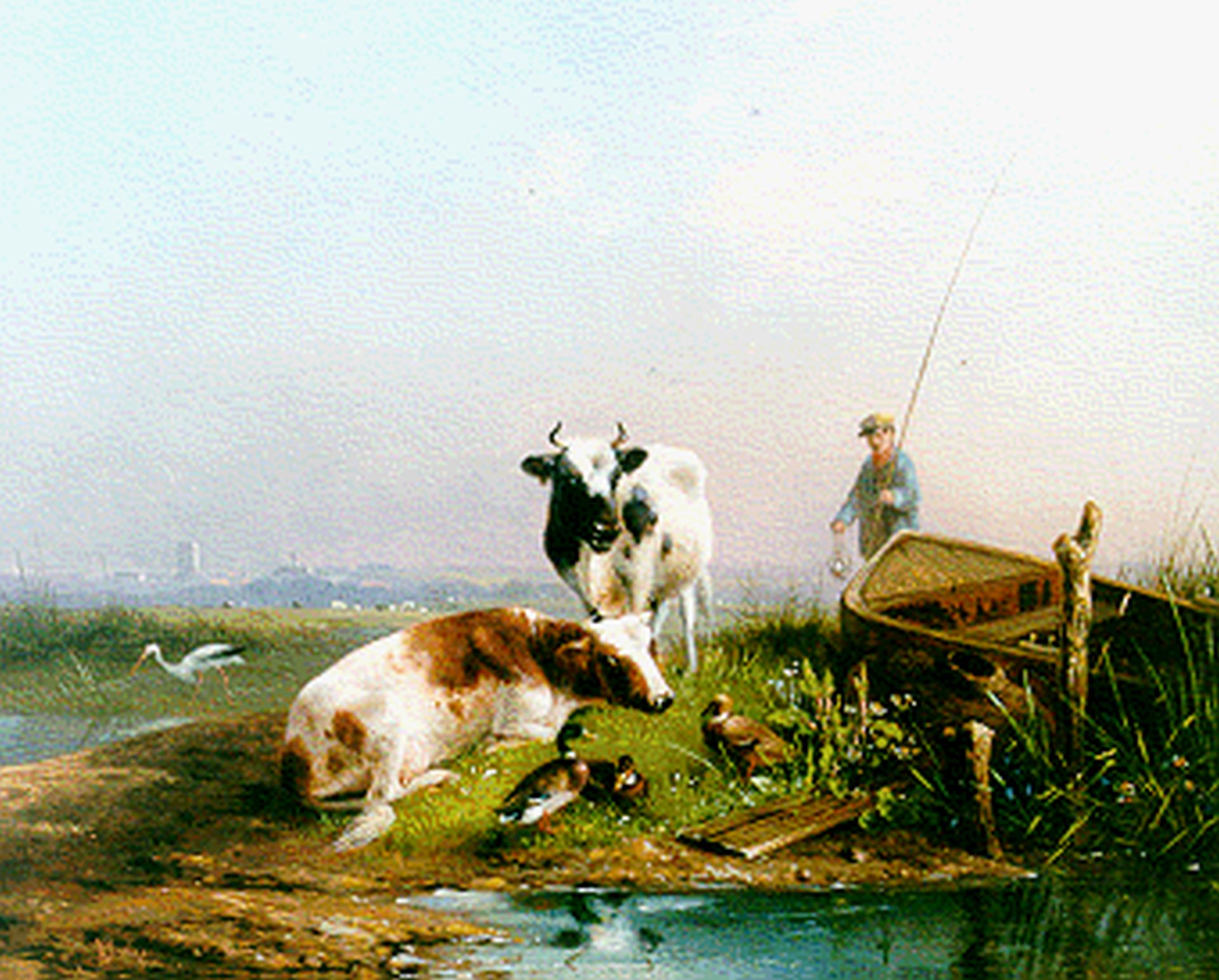 Koeien en een visser bij een stroom