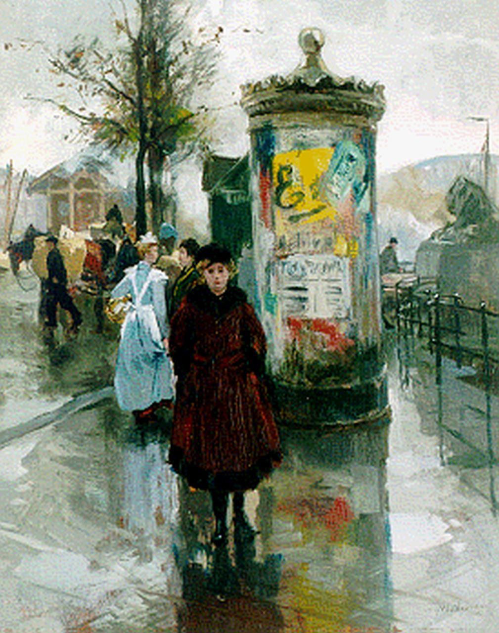 August van Voorden kunstwerk • schilderij • voorheen te koop Reclamezuil en figuren bij de Vierleeuwenbrug in Rotterdam