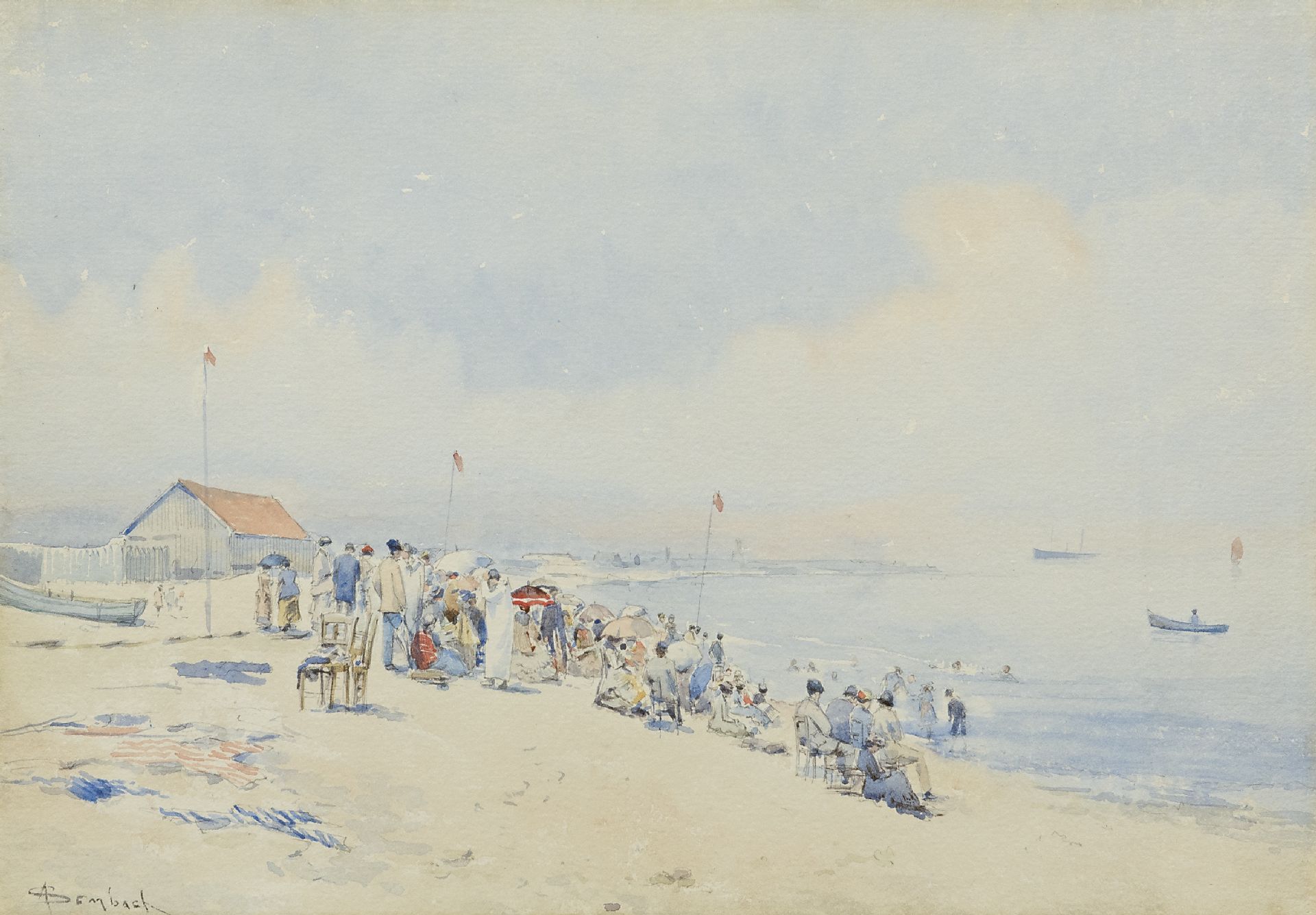 Auguste Ernest Sembach kunstwerk • aquarel • tekening • voorheen te koop Zondag op het strand aan de Belgische kust