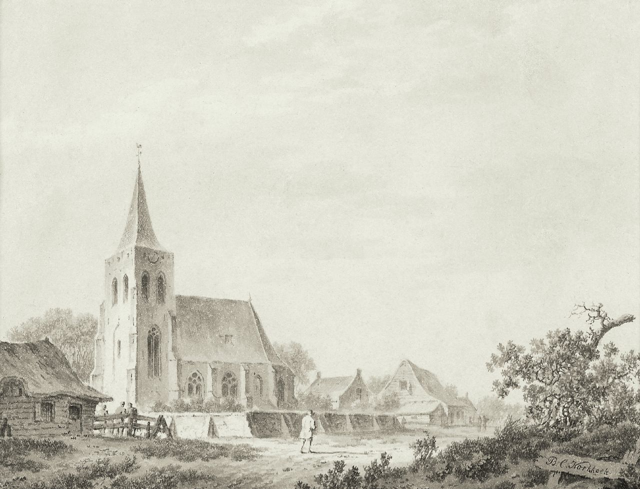 Barend Cornelis Koekkoek kunstwerk • aquarel • tekening • voorheen te koop Dorpskerk aan een zandpad