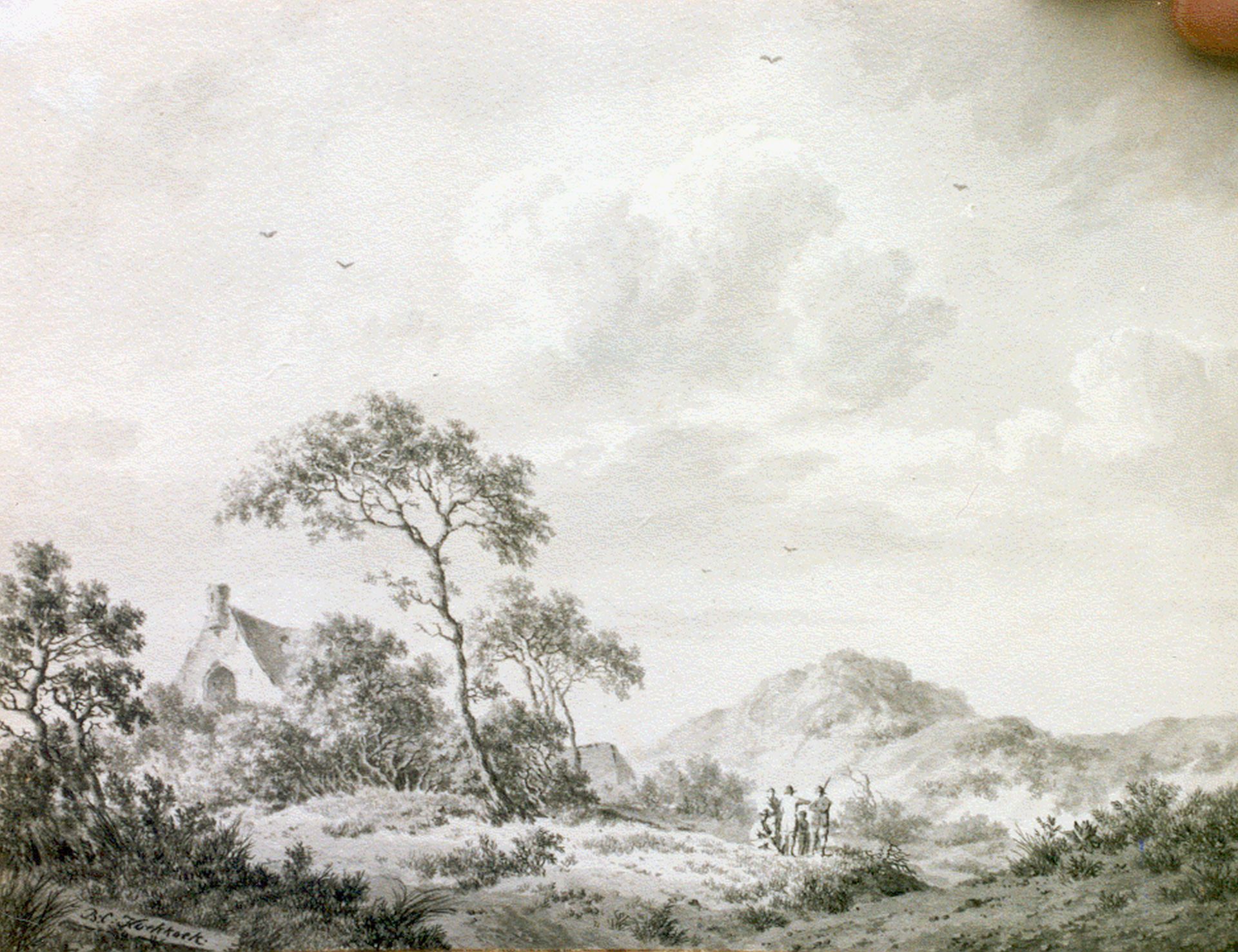 Barend Cornelis Koekkoek kunstwerk • aquarel • tekening • voorheen te koop Jagers in een heuvelachtig landschap