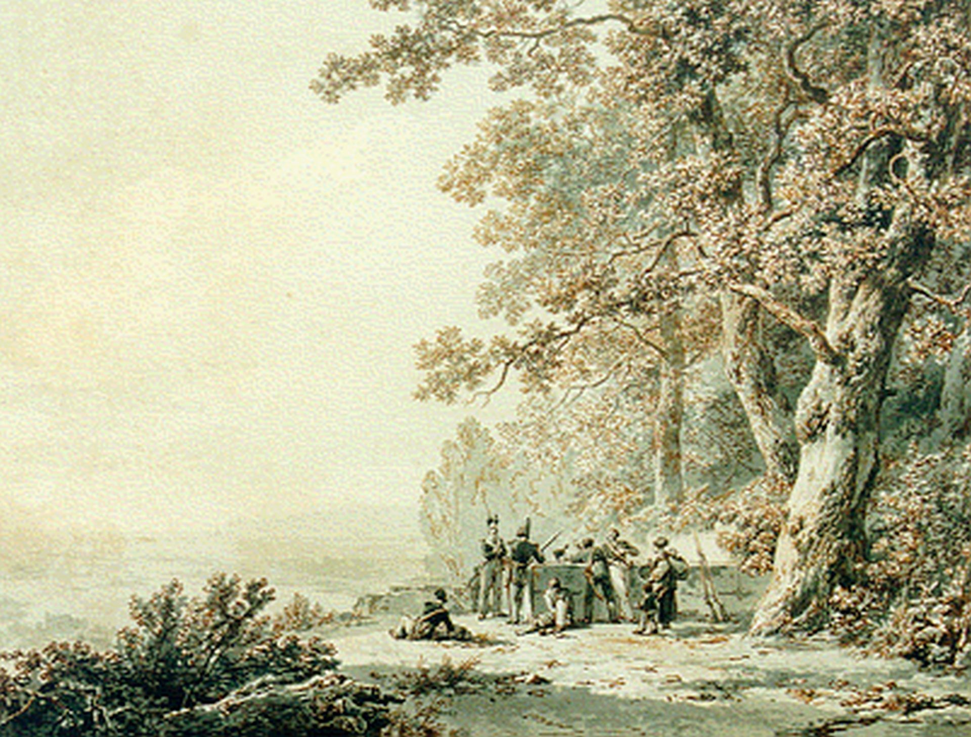 Barend Cornelis Koekkoek kunstwerk • aquarel • tekening • voorheen te koop Panoramisch landschap met militairen