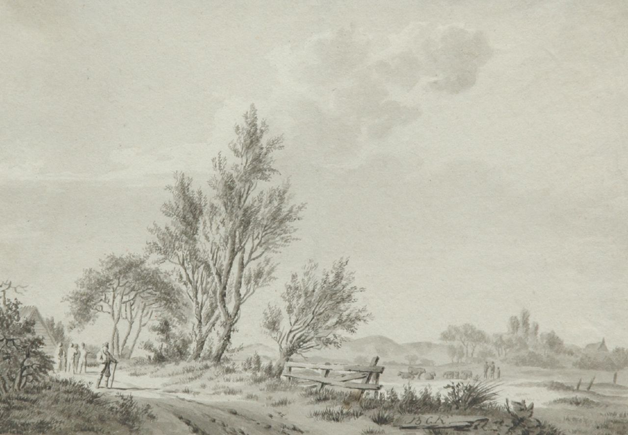 Barend Cornelis Koekkoek kunstwerk • aquarel • tekening • voorheen te koop Zomers landschap met reizigers en veehoeders