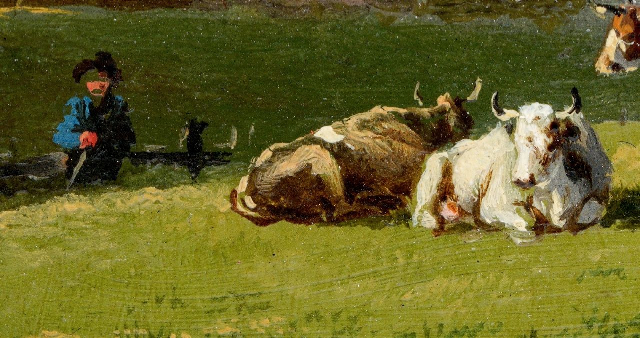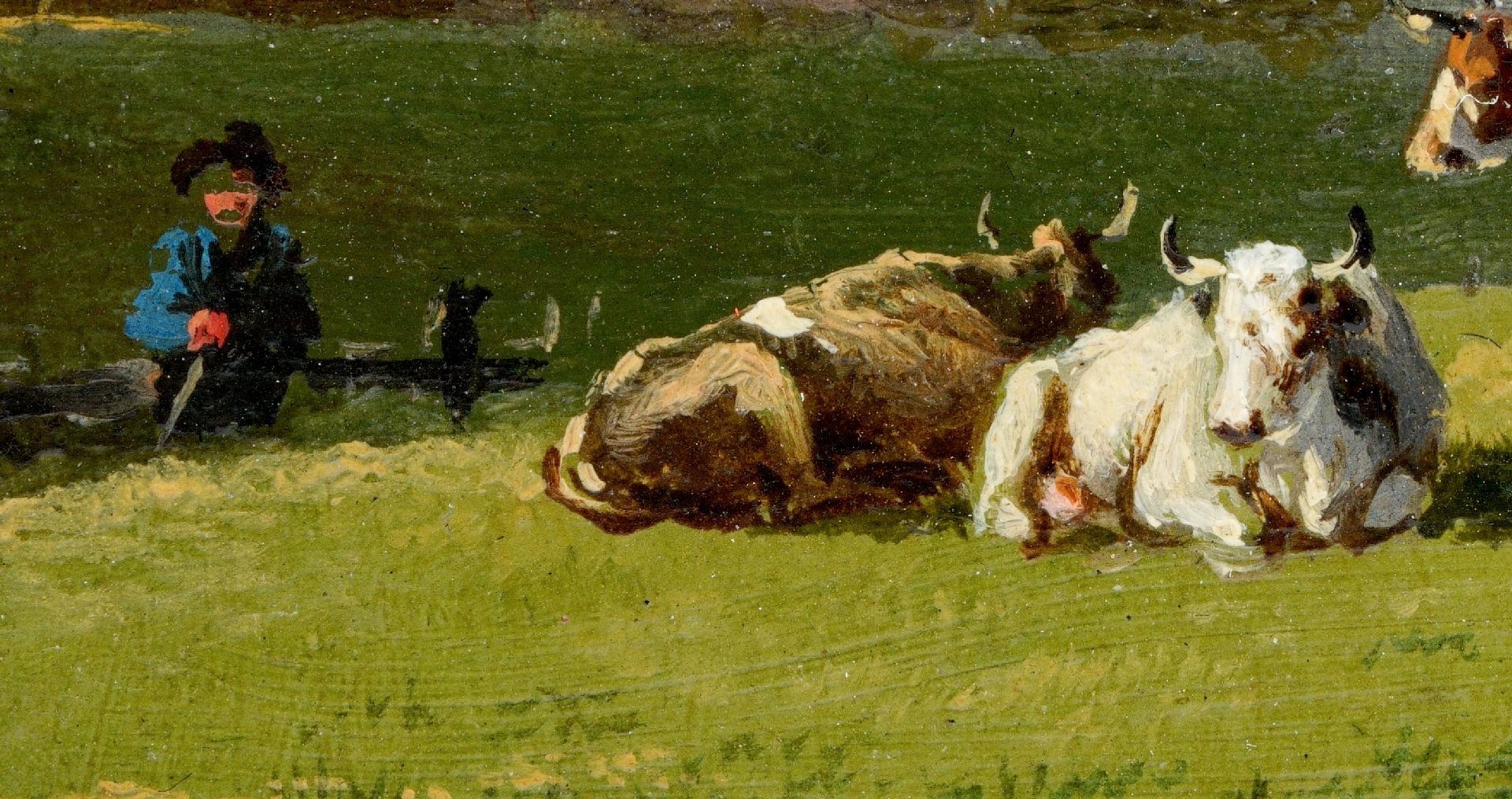 Barend Cornelis Koekkoek kunstwerk • beeld • sculptuur • te koop Dekseldoosje beschilderd met koeien in een rivierlandschap