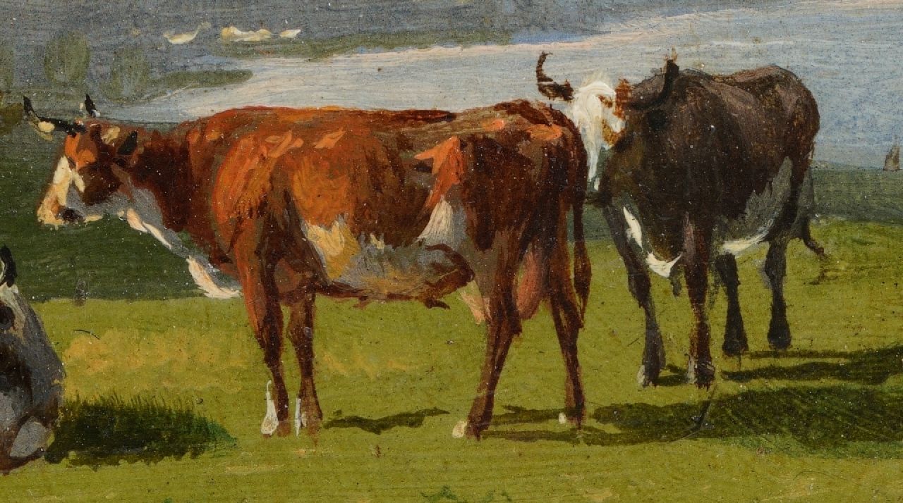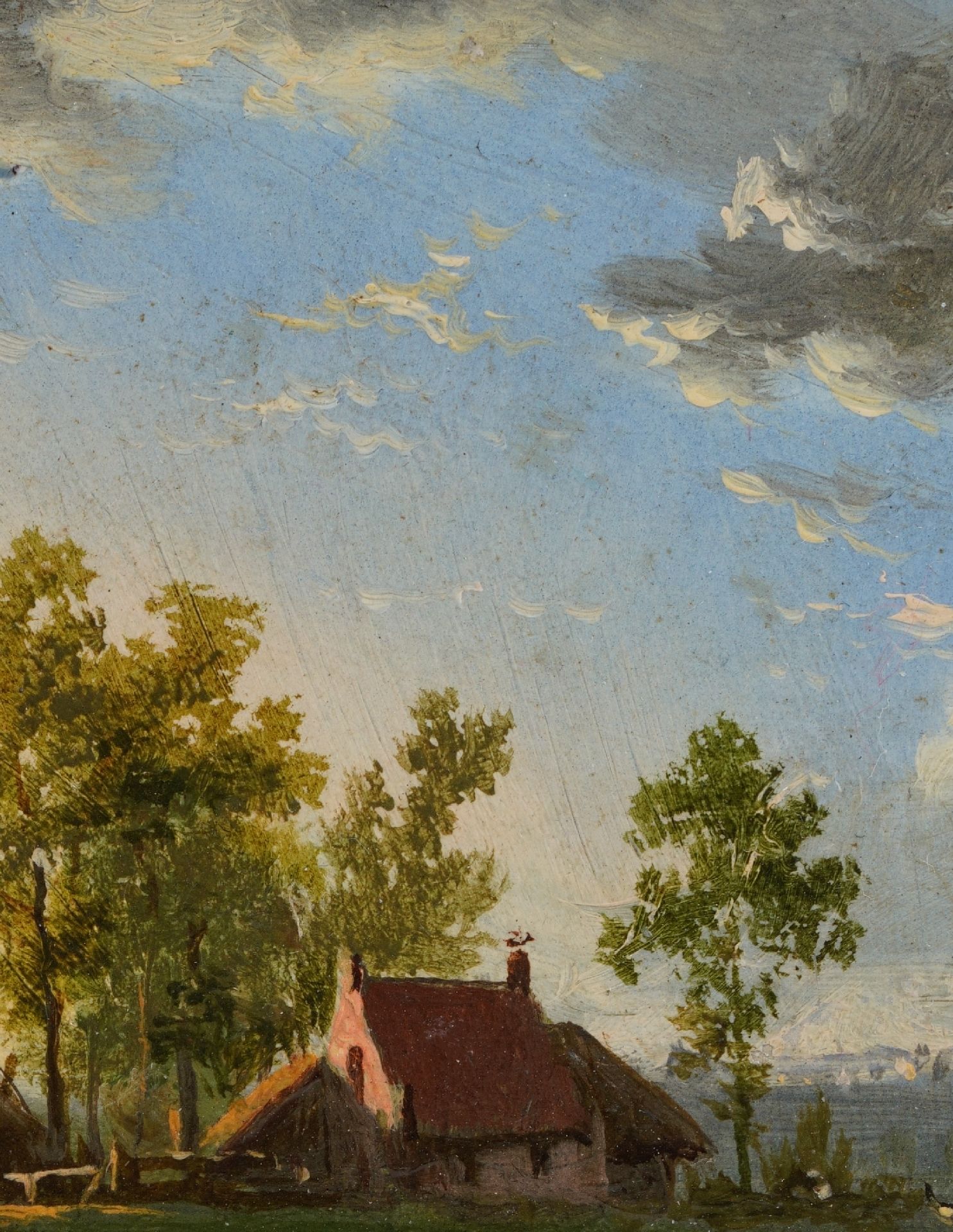 Dit kleine, ronde doosje is bijzonder en een collector's item. Waarom? Kleine beschilderde dekseldoosjes waren over het algemeen door de eeuwen heen geliefde voorwerpen om hun esthetische of emotionele waarde. Men kocht ze om toe te voegen aan een verzameling kleine, waardevolle items of om iets speciaals in op te bergen. Maar dit doosje is bijzonder omdat het deksel in 1838 werd beschilderd door Barend Cornelis Koekkoek, toen een van de beroemdste landschapschilders van ons land. Hij schilderde met een ragfijn penseeltje een Hollands landschap van sappige groene weiden, een brede vaart met schepen en welvarende koeien op een dekseltje van 7,2 diameter. Ingrediënten die menig 19e-eeuwer rijkdom hadden gebracht en waar de Hollander trots op was. Vermoedelijk werd het miniatuurschilderijtje dan ook in opdracht gemaakt.