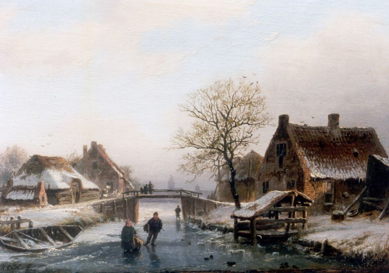 Barend Cornelis Koekkoek kunstwerk • schilderij • voorheen te koop Boerderijen aan een bevroren vaart