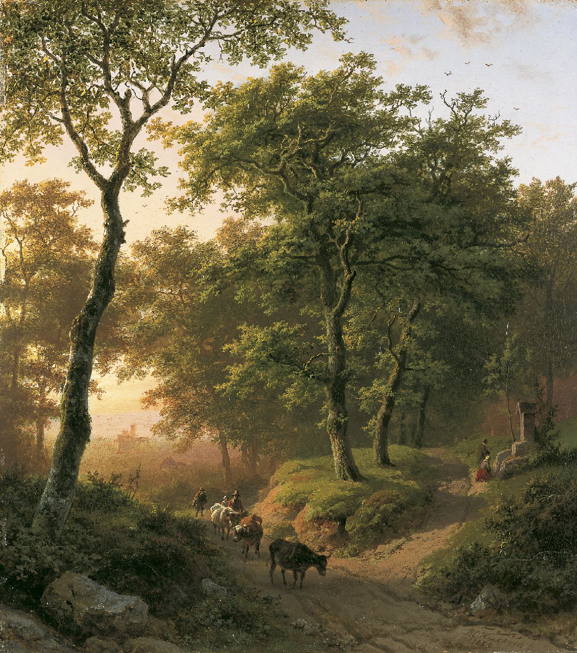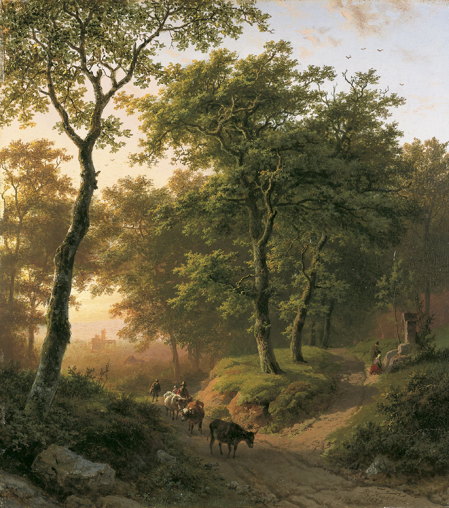 Barend Cornelis Koekkoek kunstwerk • schilderij • voorheen te koop Boomrijk landschap bij ondergaande zon