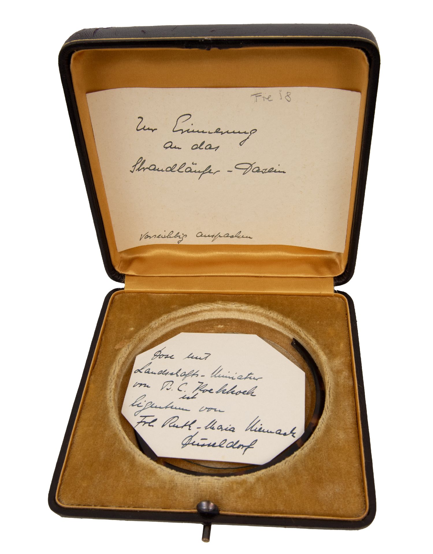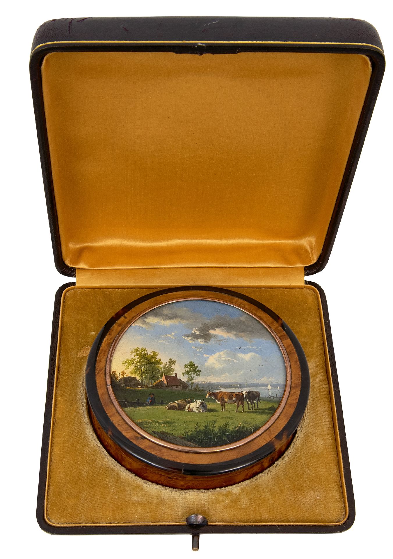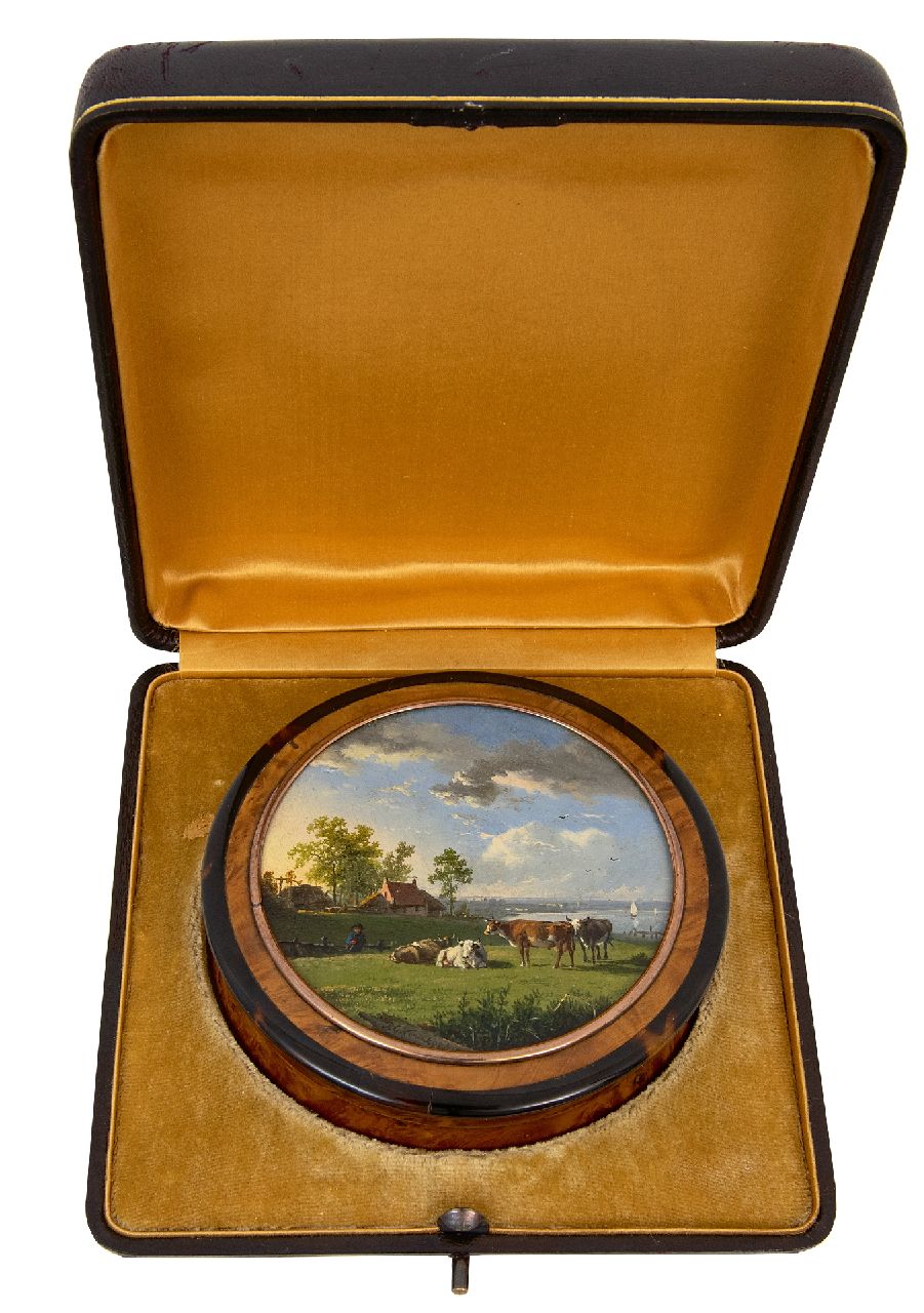 Dit kleine, ronde doosje is bijzonder en een collector's item. Waarom? Kleine beschilderde dekseldoosjes waren over het algemeen door de eeuwen heen geliefde voorwerpen om hun esthetische of emotionele waarde. Men kocht ze om toe te voegen aan een verzameling kleine, waardevolle items of om iets speciaals in op te bergen. Maar dit doosje is bijzonder omdat het deksel in 1838 werd beschilderd door Barend Cornelis Koekkoek, toen een van de beroemdste landschapschilders van ons land. Hij schilderde met een ragfijn penseeltje een Hollands landschap van sappige groene weiden, een brede vaart met schepen en welvarende koeien op een dekseltje van 7,2 diameter. Ingrediënten die menig 19e-eeuwer rijkdom hadden gebracht en waar de Hollander trots op was. Vermoedelijk werd het miniatuurschilderijtje dan ook in opdracht gemaakt.