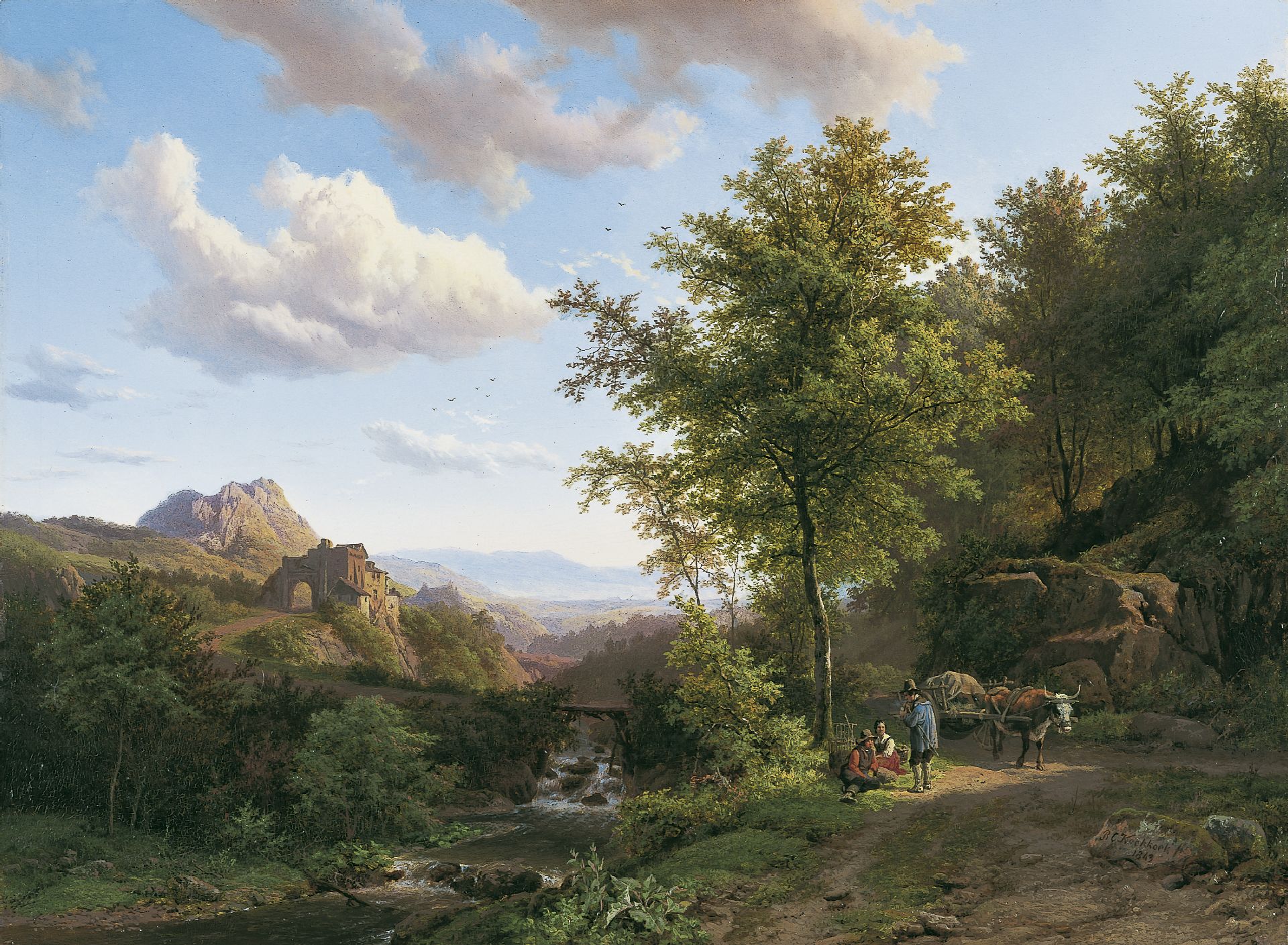 Barend Cornelis Koekkoek kunstwerk • schilderij • voorheen te koop Heuvellandschap met rustend boerenvolk onder een eik
