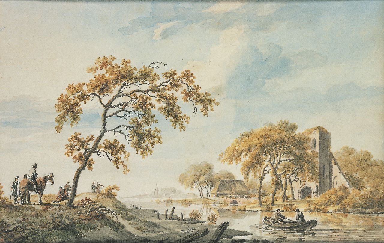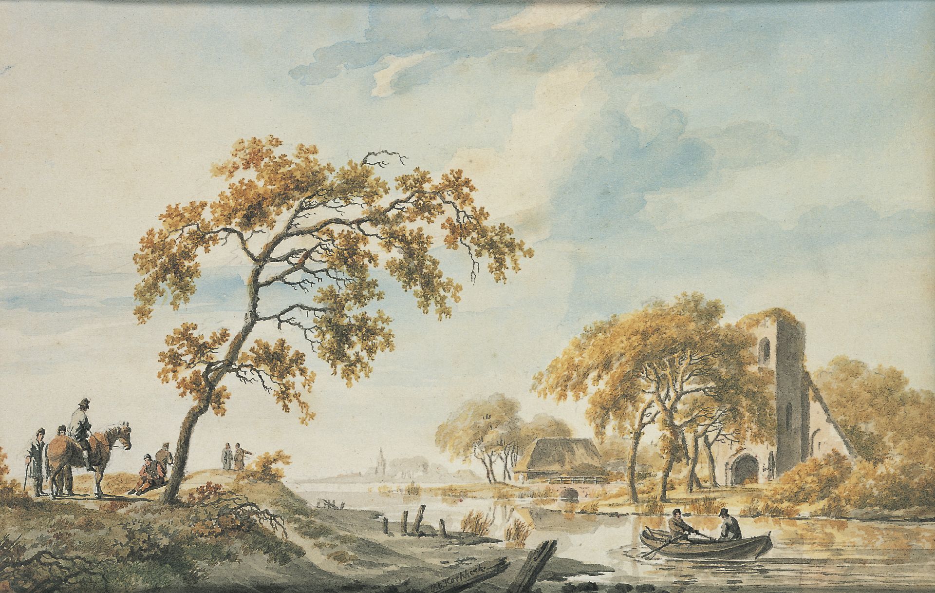 Barend Cornelis Koekkoek kunstwerk • aquarel • tekening • voorheen te koop Landvolk bij een rivier met ruïne