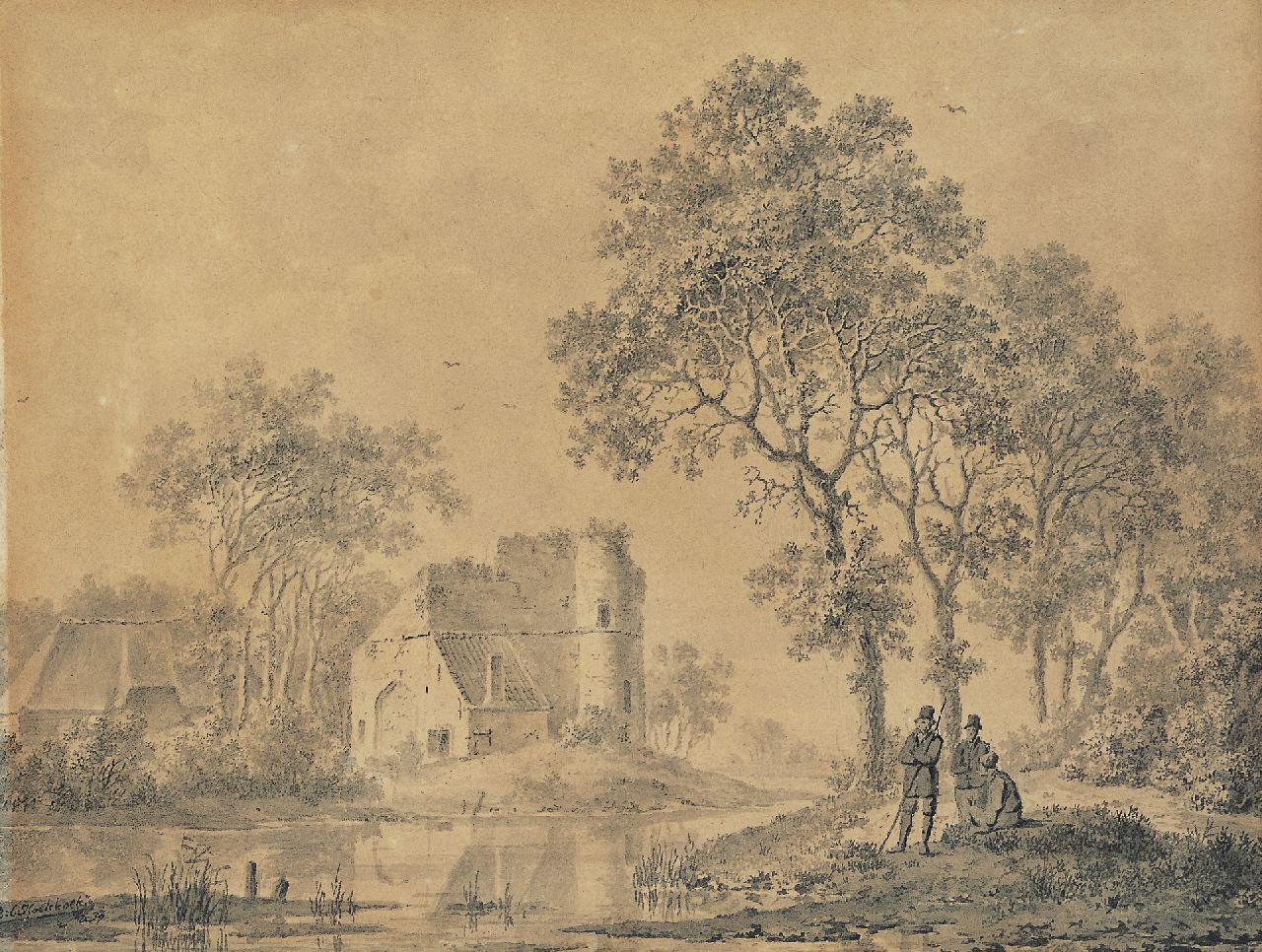 Barend Cornelis Koekkoek kunstwerk • aquarel • tekening • voorheen te koop Landvolk bij een ruïne
