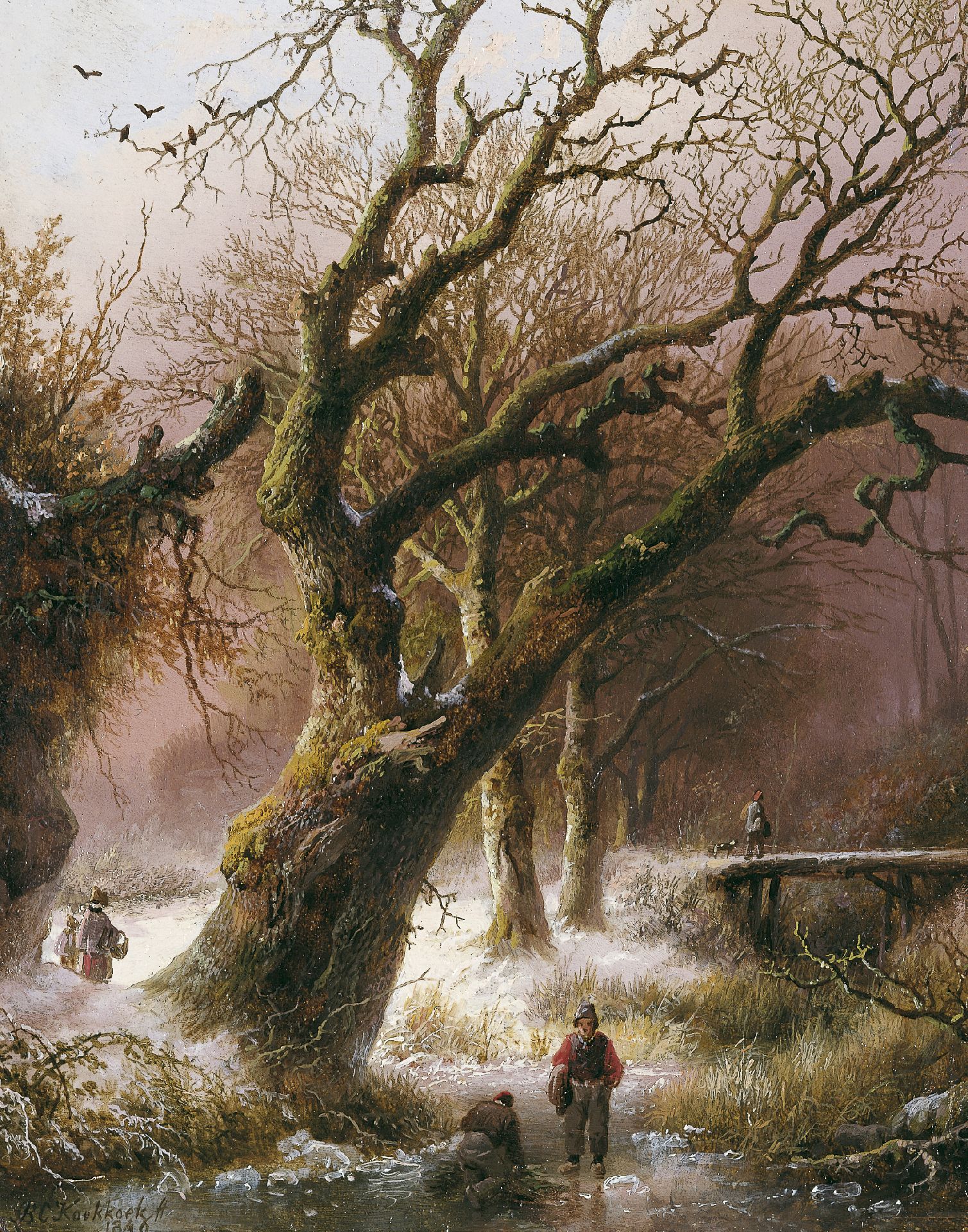 Barend Cornelis Koekkoek kunstwerk • schilderij • voorheen te koop Winters bosgezicht met bevroren beek