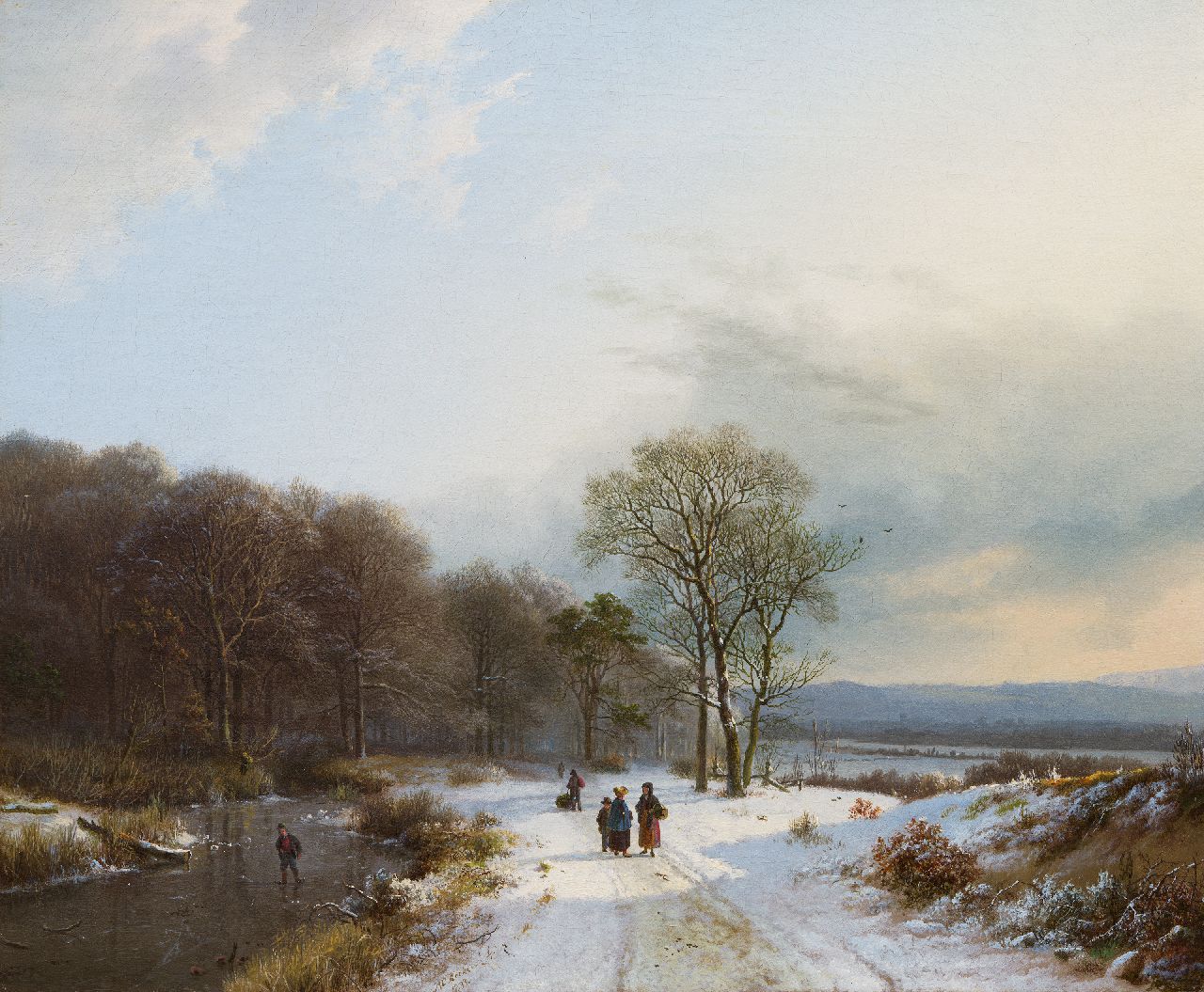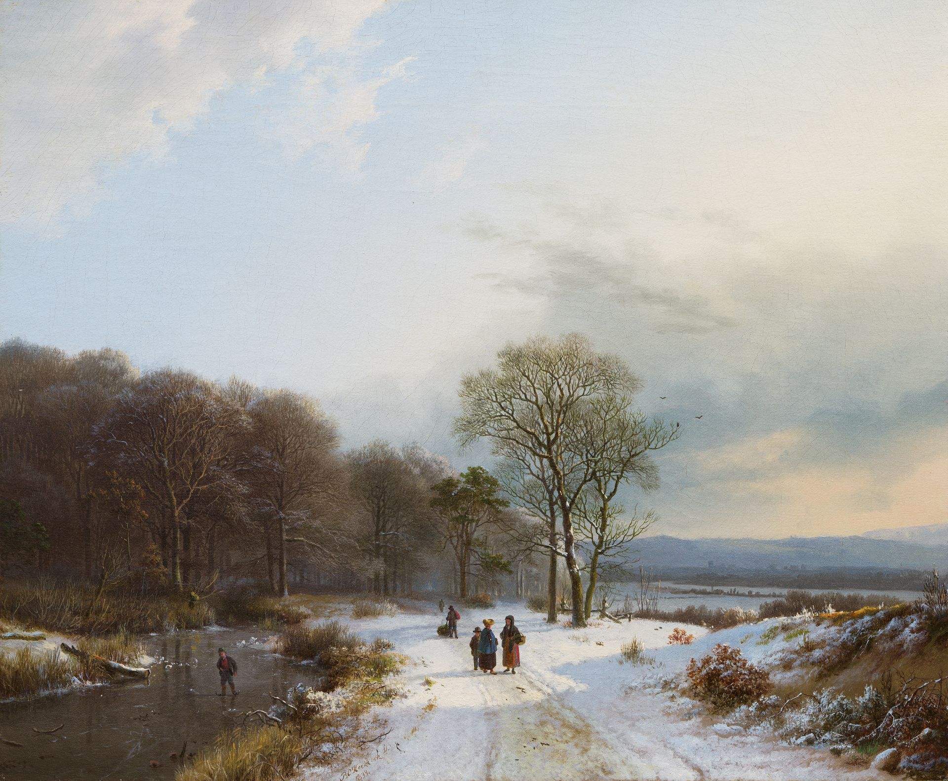 Barend Cornelis Koekkoek kunstwerk • schilderij • voorheen te koop Winters boslandschap met figuren