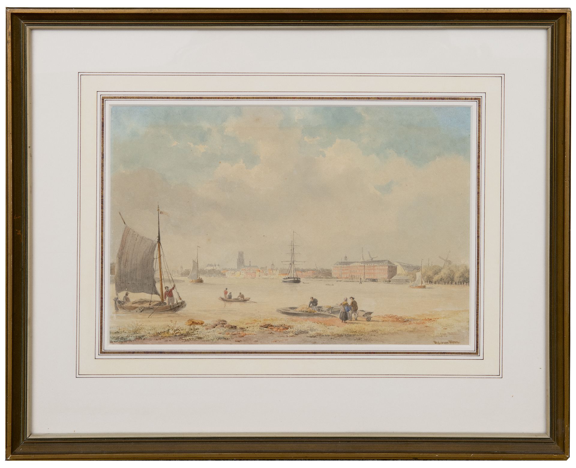 Hove B.J. van | Bartholomeus Johannes 'Bart' van Hove | Aquarellen en tekeningen te koop aangeboden | Bedrijvigheid op de rivier bij een stad, aquarel op papier 24,0 x 35,0 cm, gesigneerd rechtsonder