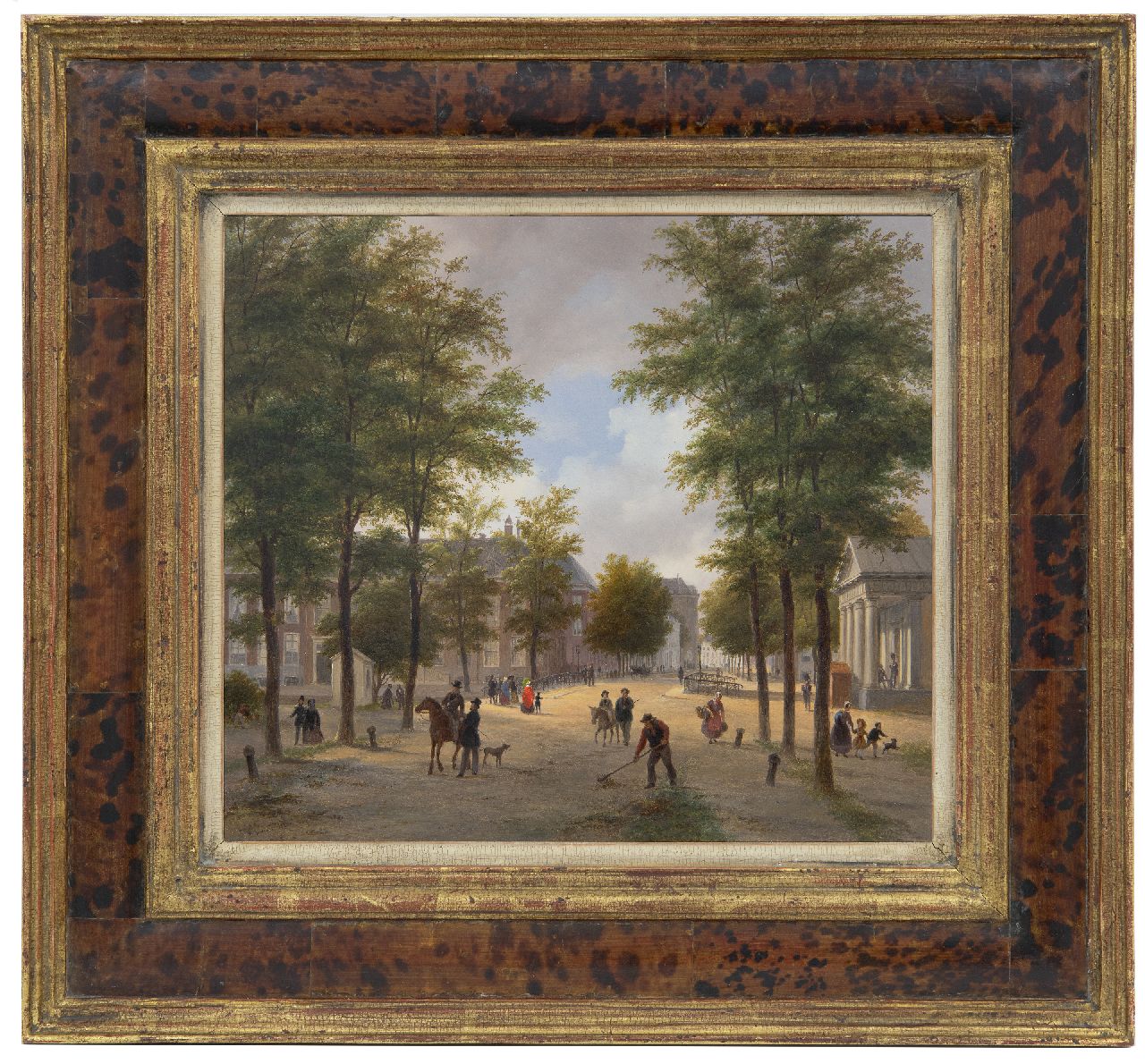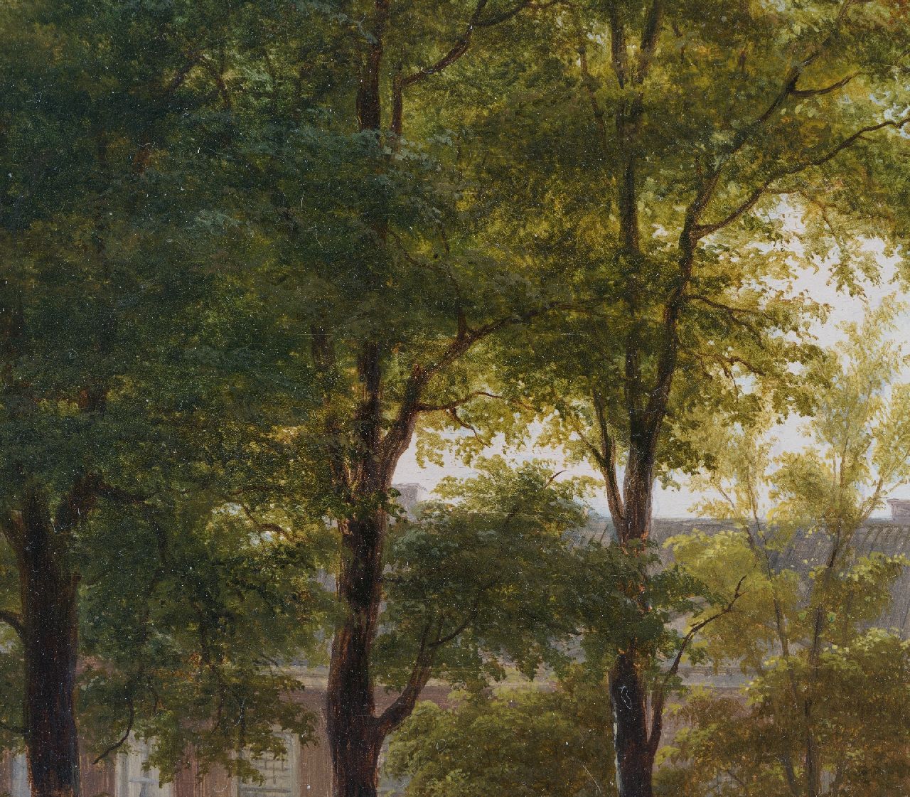B.J. van Hove was een leerling van de Haagse decoratieschilder J.H.A.A. Breckenheijmer, later van de Haagse Tekenacademie. Hij was in zijn tijd al een belangrijk schilder van romantische stadsgezichten waarin fantasie een grote rol speelde. Daarnaast was hij werkzaam als toneel- en decorschilder. In 1829 werd hij decorateur van de Koninklijke Nederlandsche Schouwburg in Den Haag. Van Hove speelde een belangrijke rol in de ontwikkeling van de 19e-eeuwse schilderkunst door zijn vele leerlingen, onder wie J. Bosboom, Verveer en H.J. Weissenbruch. In dit Haagse stadsgezicht is rechts het wachthuis of 'Wachtje' zichtbaar, dat door Zeger Reyers in 1827/1828 werd gebouwd in opdracht van koning Willem I. Het gebouwtje, dat gebruikt werd om accijns te innen, lag bij de Bosbrug langs de weg tussen het Korte Voorhout en het Malieveld. Het gebouw raakte tijdens de Tweede Wereldoorlog beschadigd en werd na 1947 afgebroken. Links achter het kleine huisje is de officiele woning van de Admiraal van de Staatse Vloot zichtbaar.