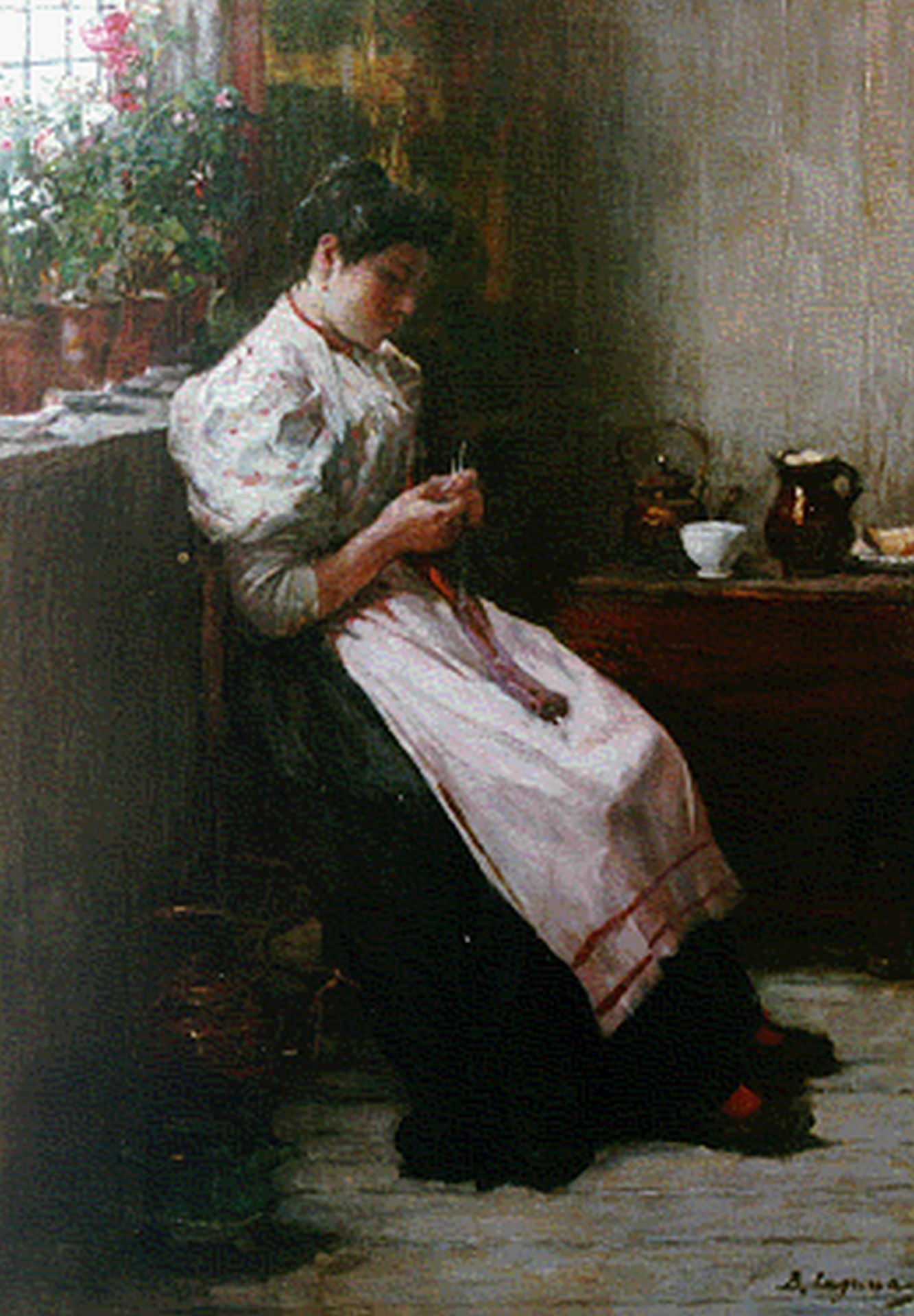 Baruch Lopes de Leao Laguna kunstwerk • schilderij • voorheen te koop Breiende vrouw in interieur