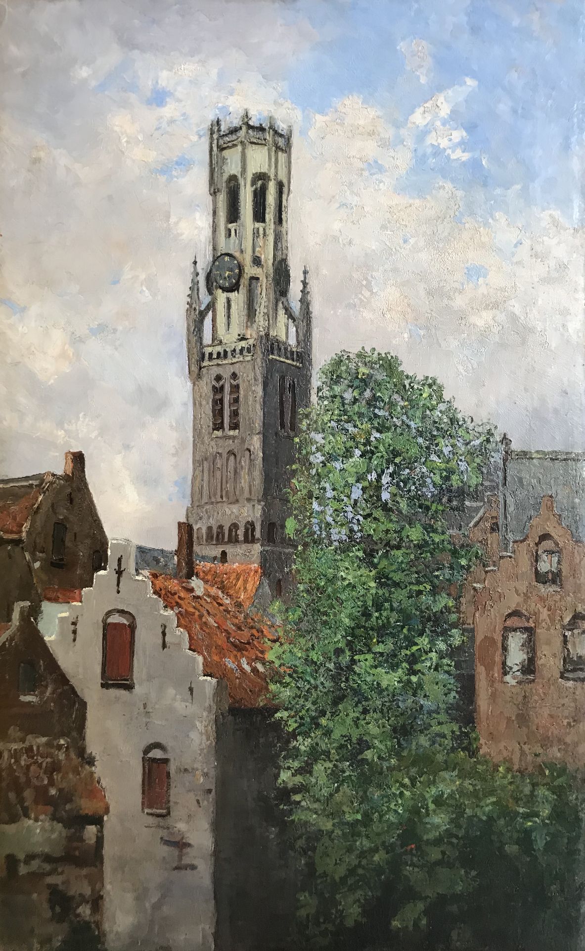 Belgische School, eerste helft 20e eeuw kunstwerk • schilderij • voorheen te koop Gezicht in Brugge met het Belfort