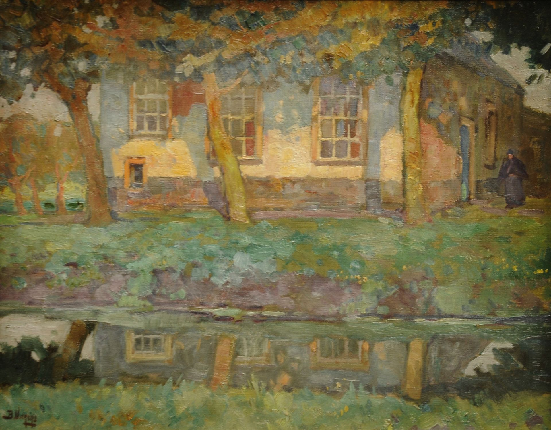 Ben Viegers kunstwerk • schilderij • voorheen te koop Boerderij weerspiegeld in het water