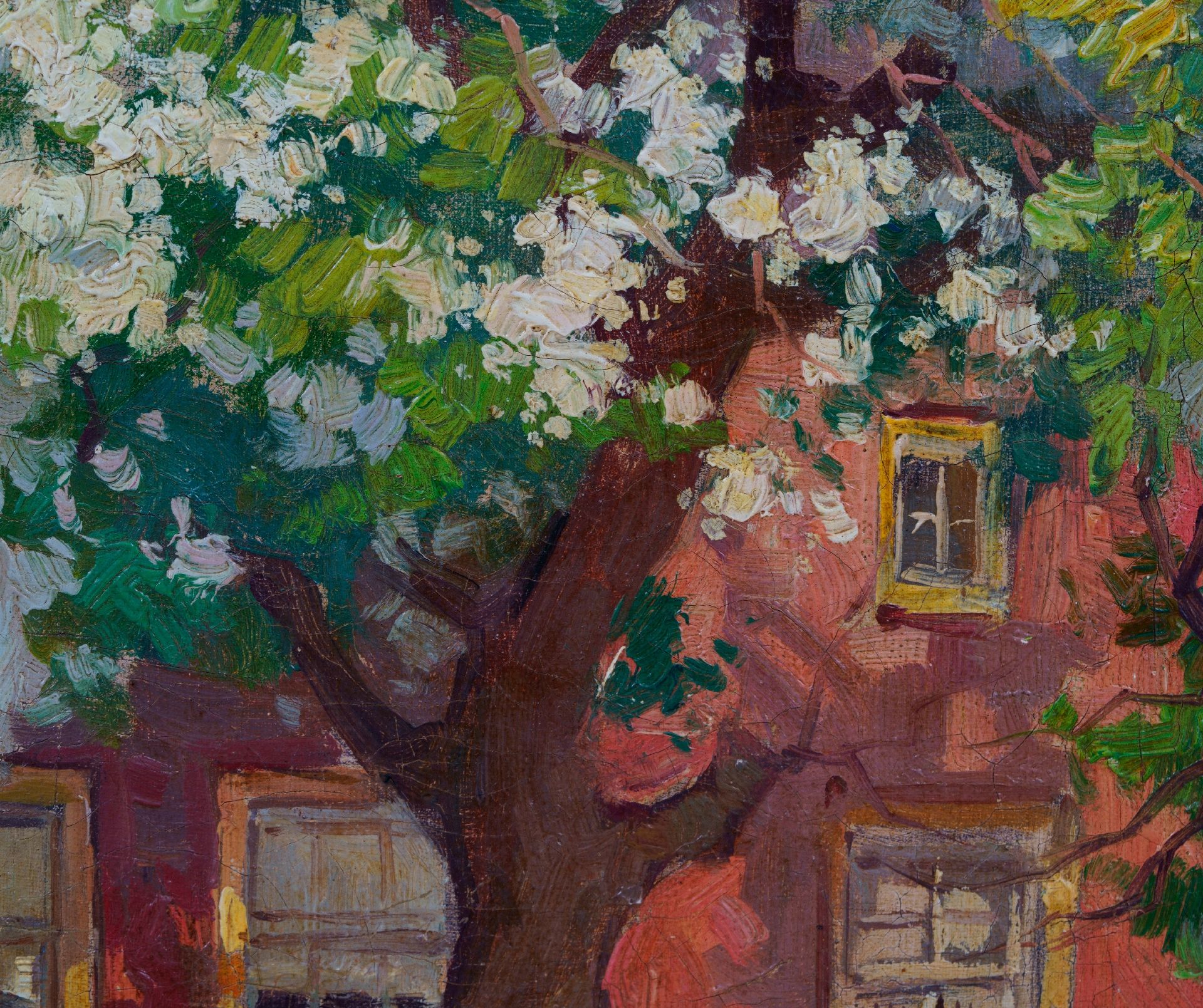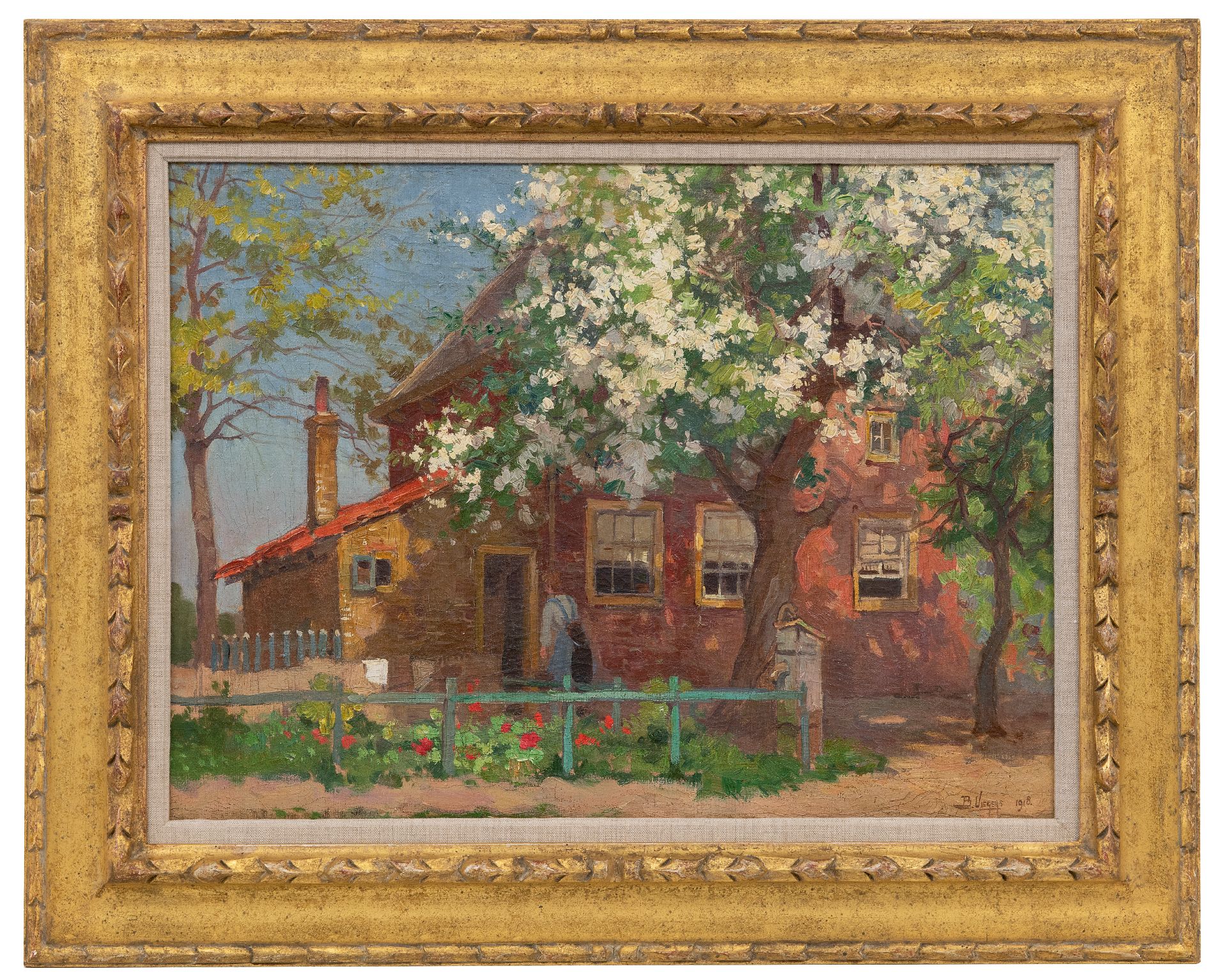 Ben Viegers kunstwerk • schilderij • te koop Boerenhoeve met bloeiende fruitboom