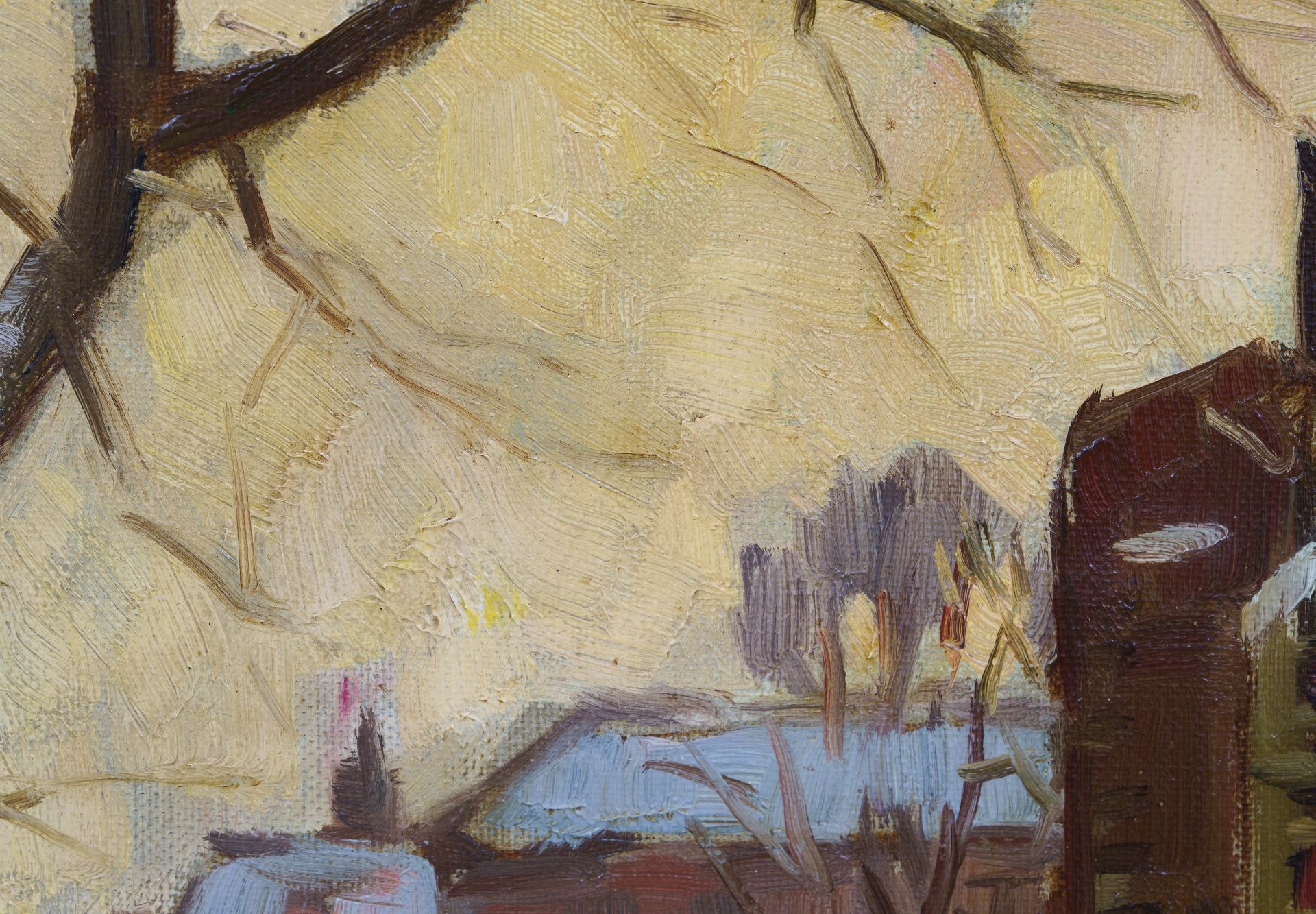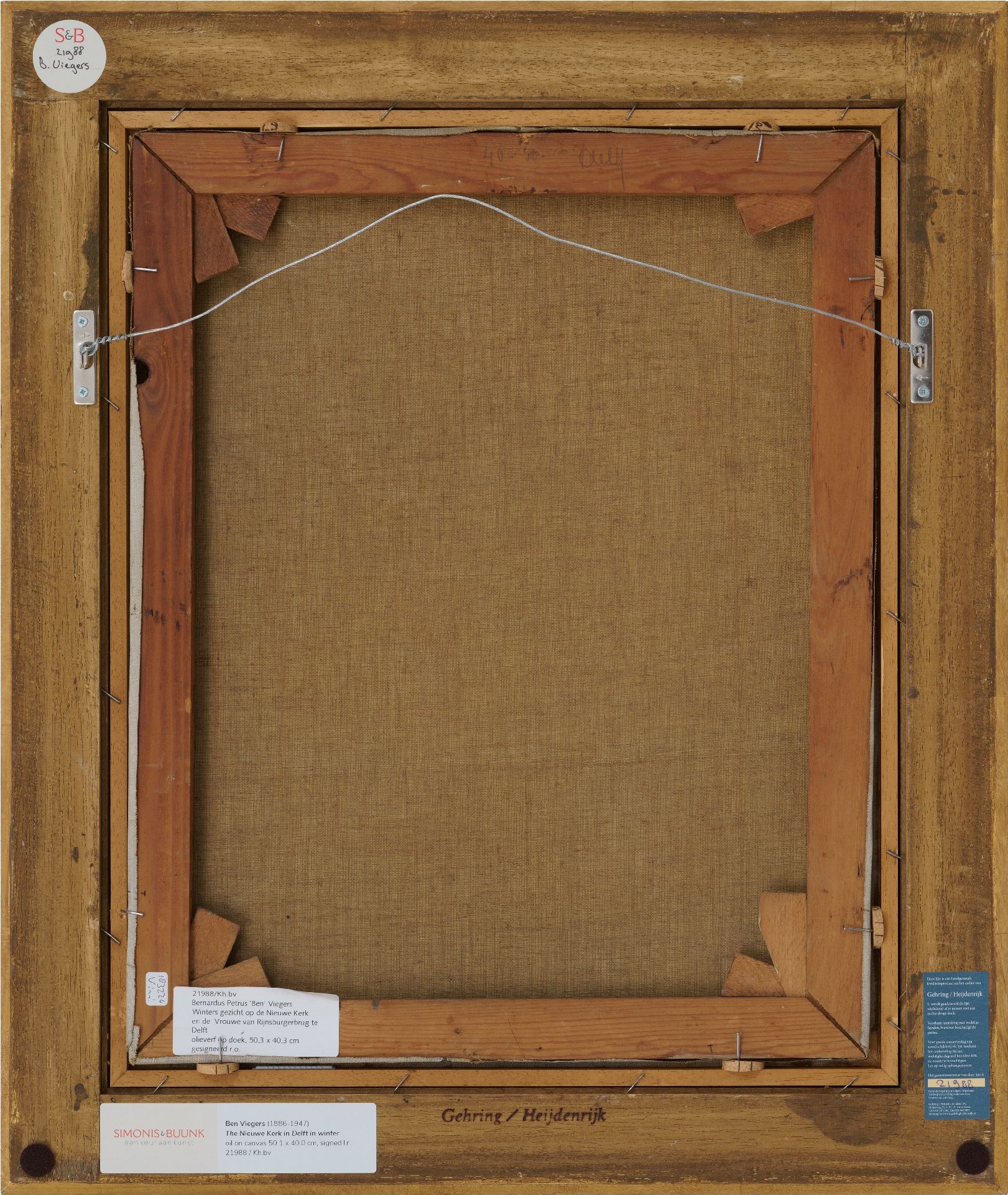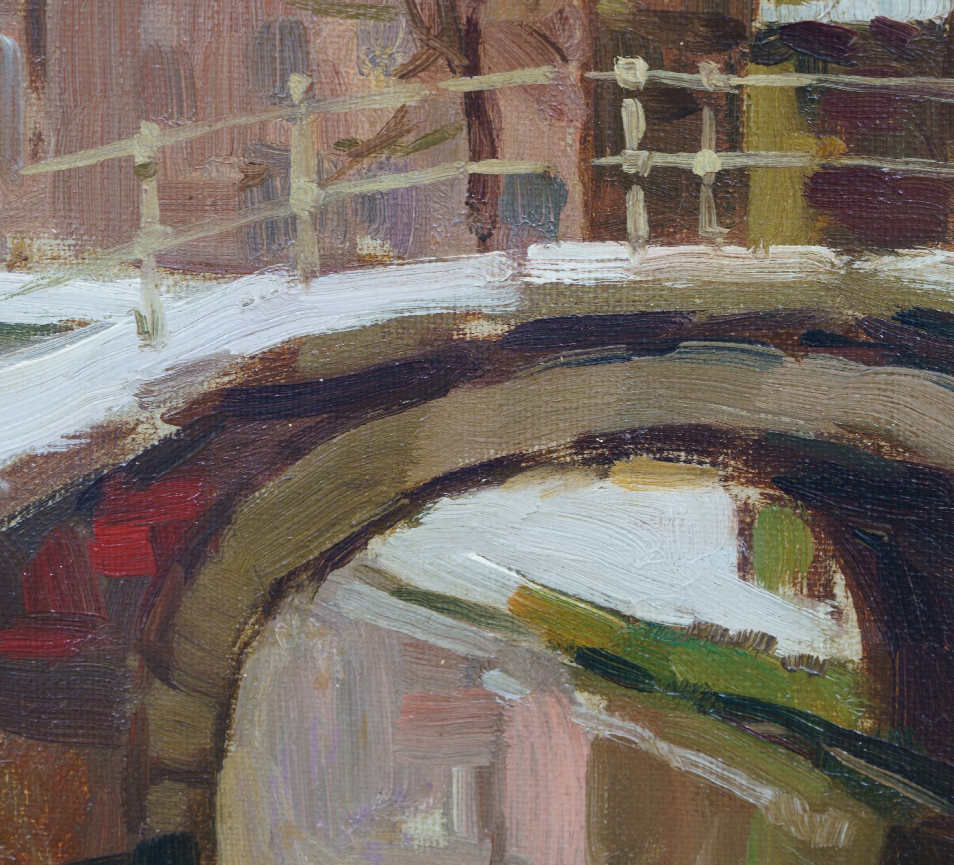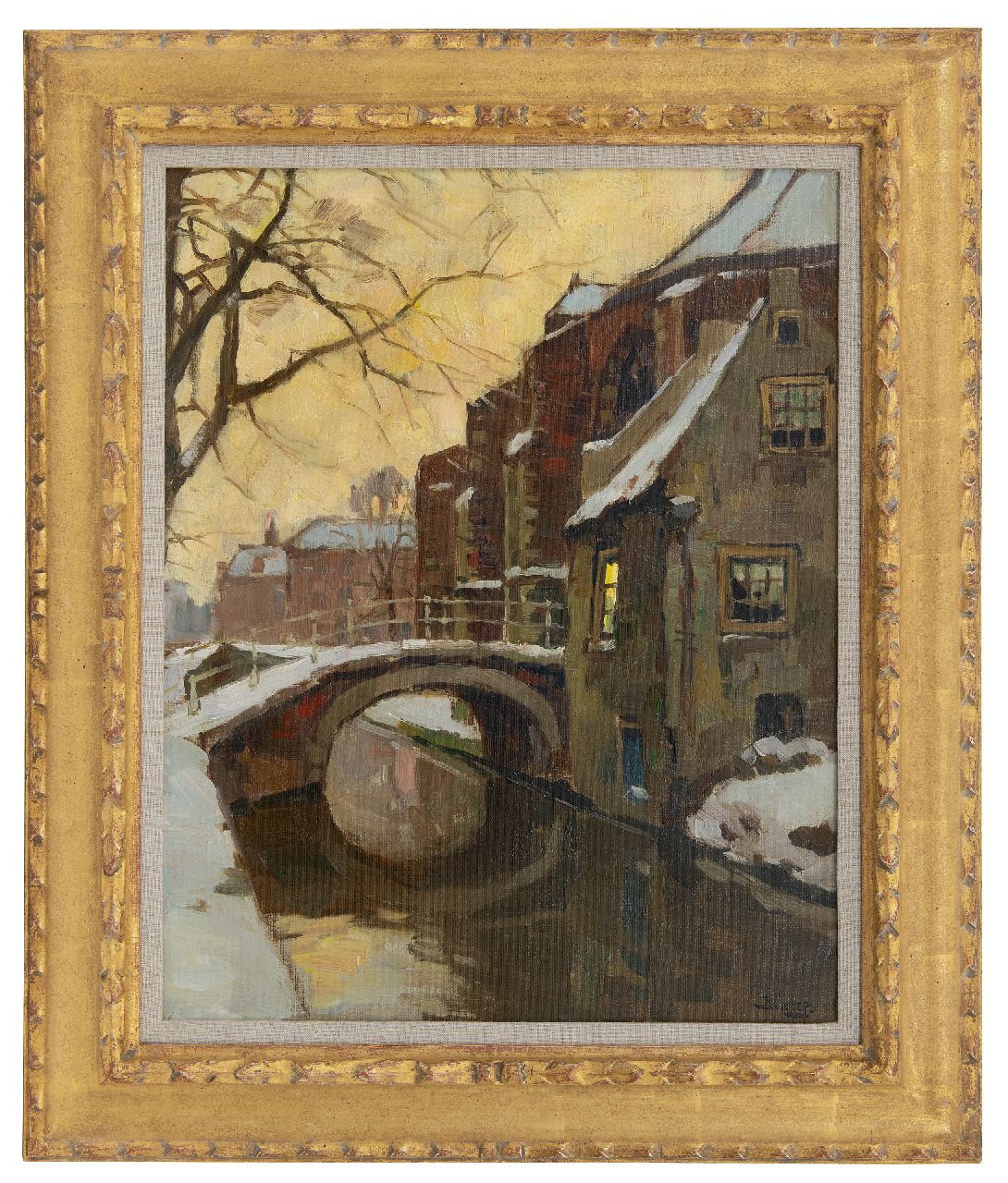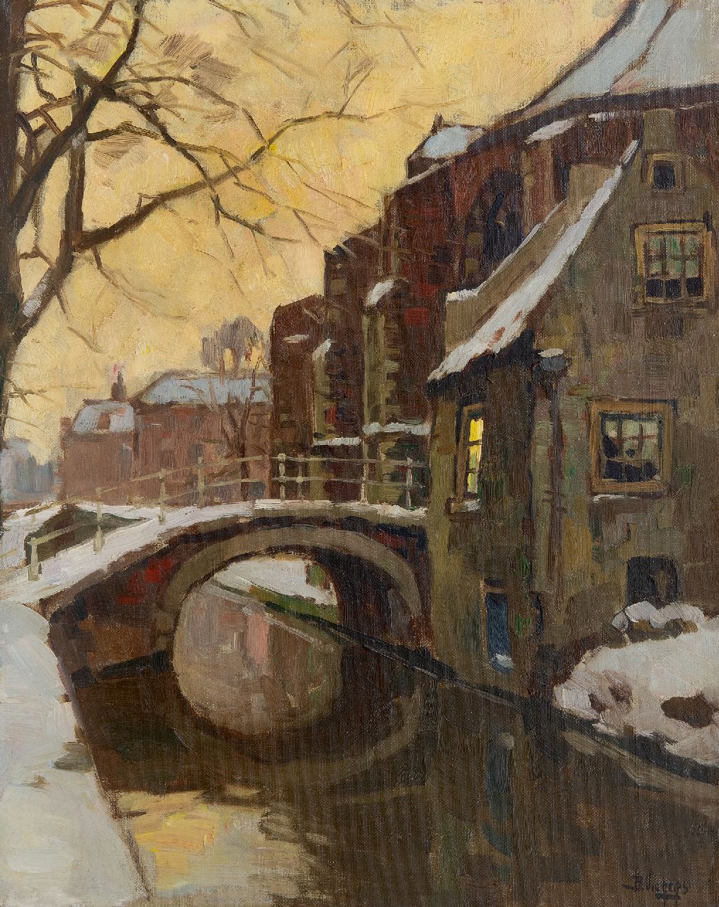 Ben Viegers kunstwerk • schilderij • voorheen te koop Winters gezicht op de Nieuwe Kerk en de Vrouwe van Rijnsburgerbrug te Delft